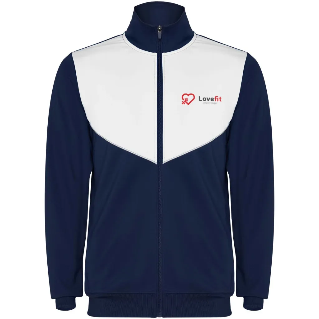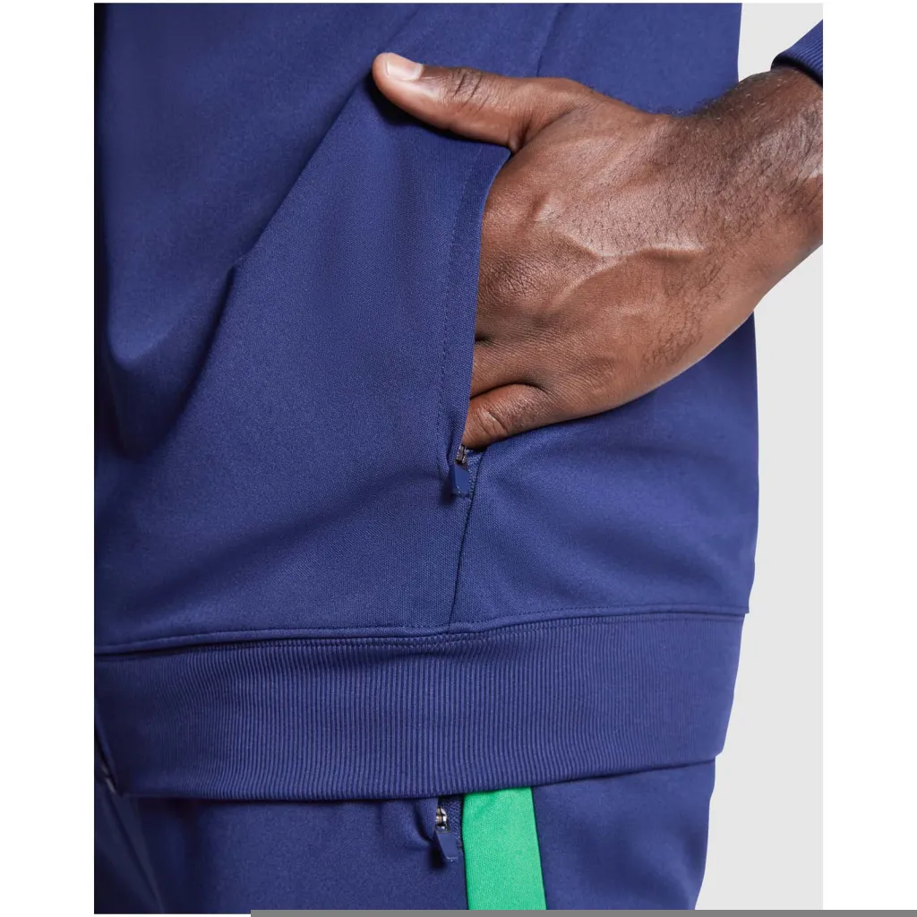 Tracksuit in lightweight and elastic fabric. Jacket with contrasting colour and sewing trims on the chest. High collar with contrasting seams. Center front zip. Side pockets. 2x2 ribbed cuffs and waist. Trousers with elastic waistband and drawstring. Contrasting side piece with sewing trim. Zipped hem.