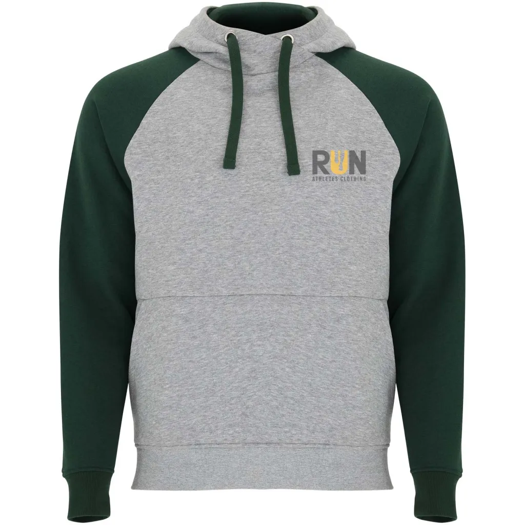 Two-colour unisex hoodie. Hood with crossed neck and metal eyelets. Contrasting inner hood, drawcord and raglan sleeves. Kangaroo pocket. Cuffs and hem in 1x1 elastane rib knit. Removable label.