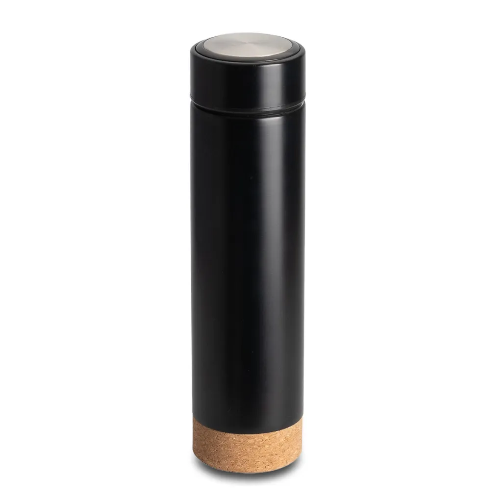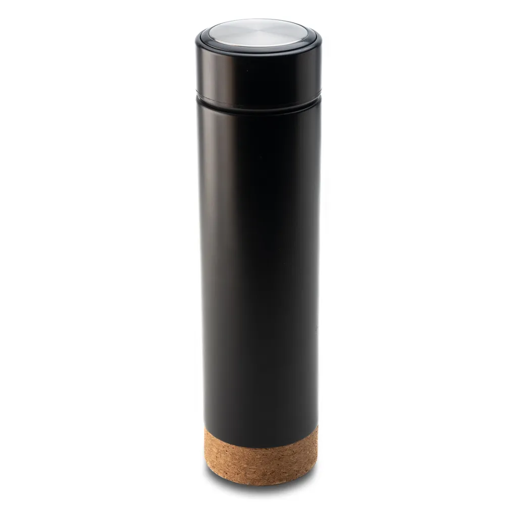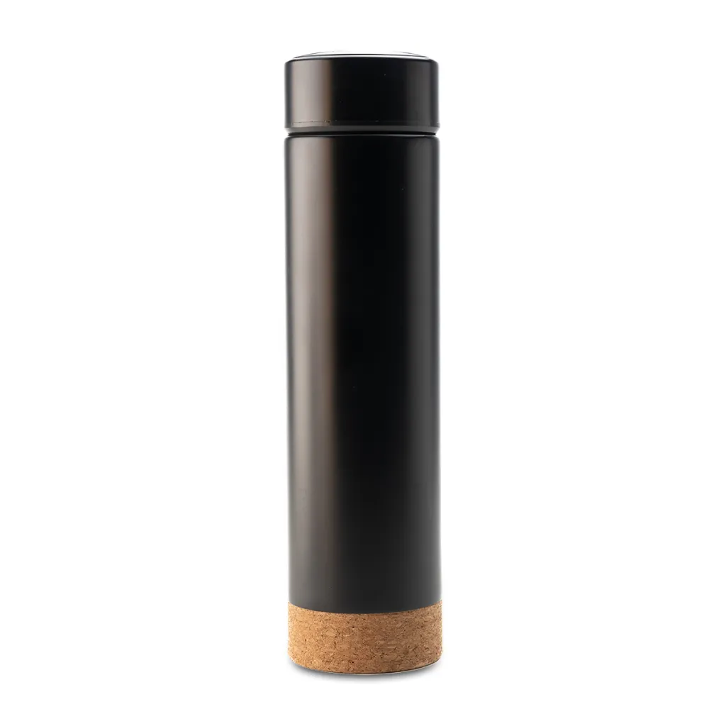 Leakproof 450 ml vacuum flask. 2 stainless steel walls, inside upgraded 18/8. Vaccum between two walls gives the flask perfect thermal insulation properties. Beautifully designed. It captivates with an elegant combination of black colour and cork base. It has a steel infuser for tea.