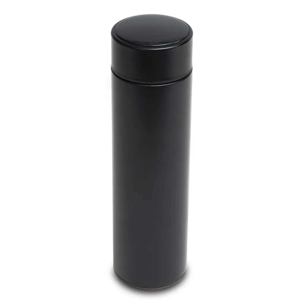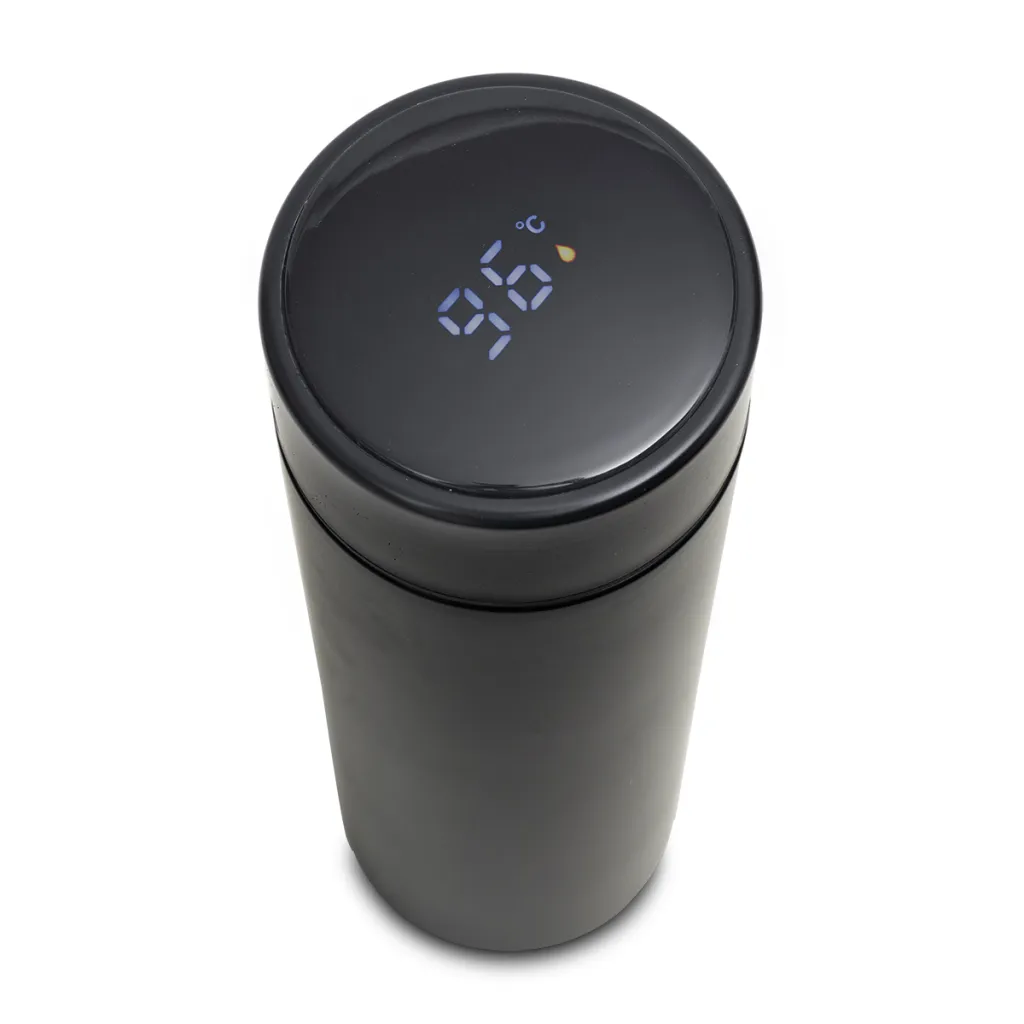 Vacuum flask, 420 ml with two metal walls, perfectly keeping the heat in. The inside is made of high-quality 18/8 stainless steel. It has a thermometer with replaceable battery CR2032, built into the cap, which shows the temperature of the drink when you touch the display. Tea infuser is included. Glossy surface finishing. It keeps temperature of 40 degrees Celsius for 15 hrs.
