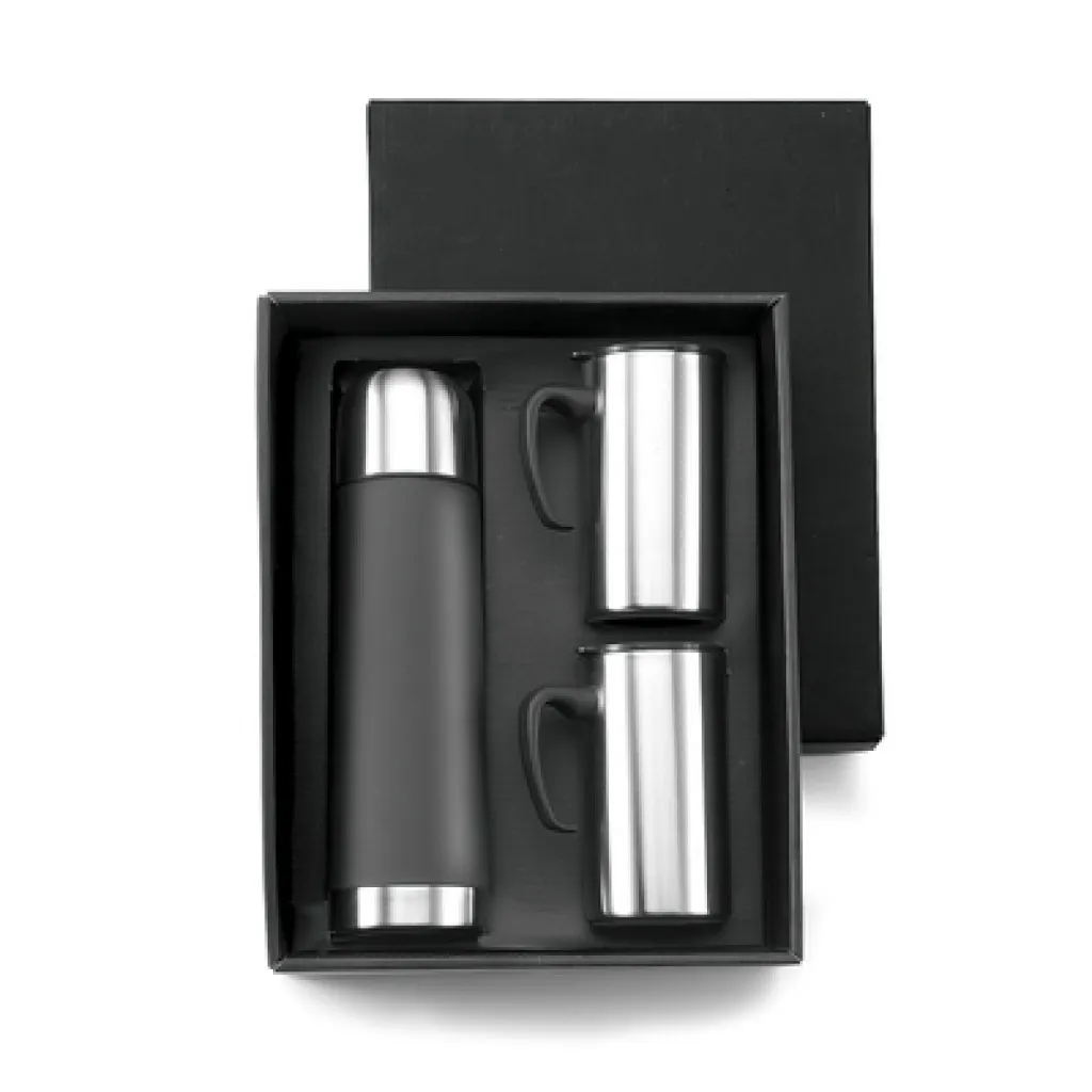 Travel set in gift box, double walled vacuum flask 475 ml and 2 mugs 265 ml, thermal insulation scale: 4 +leakproof