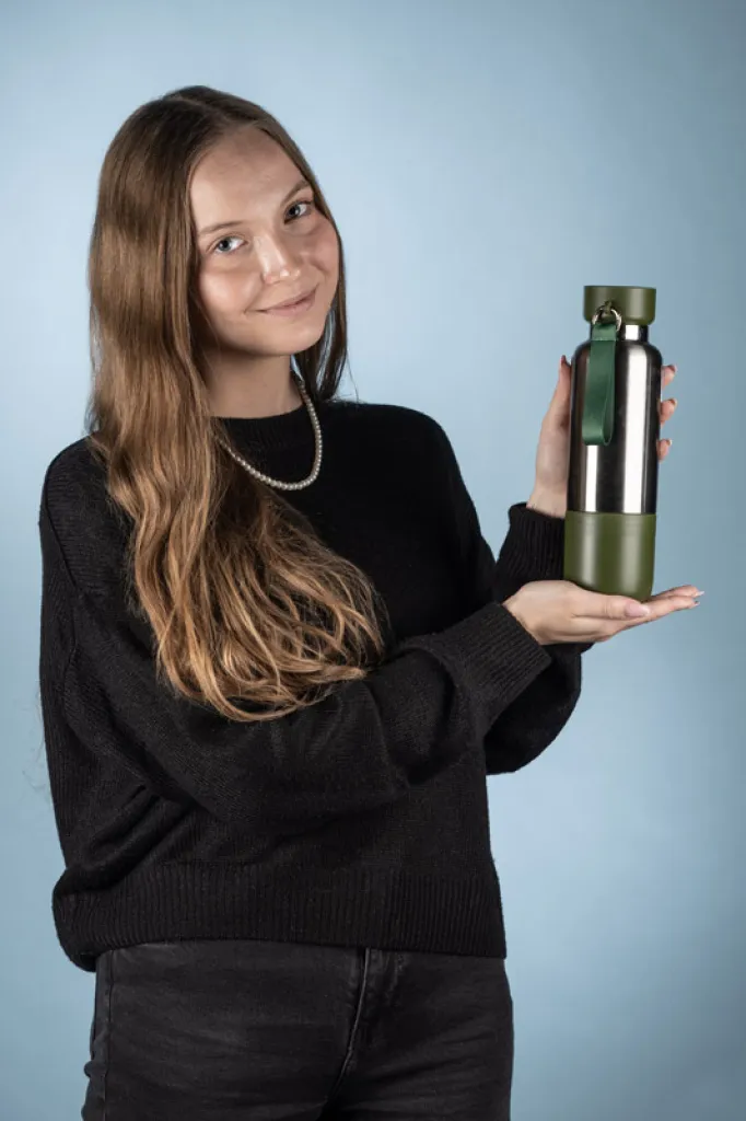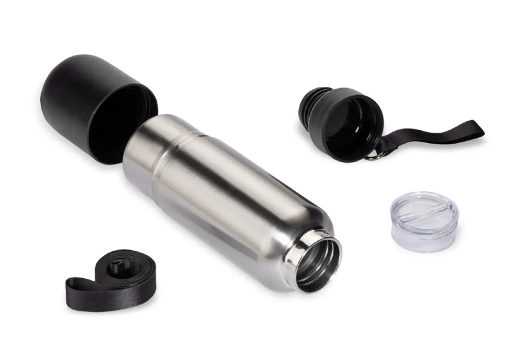 The RON thermal bottle is an excellent choice for active people who value both convenience and functionality. It will be ideal for training and spontaneous outings. The bottle is equipped with a carabiner and two lanyards: a short and a long lanyard to alternate, allowing for comfortable carrying and easy adaptation to different situations. Simply wear it on your wrist when running or hang it on your back when hiking. In addition, the RON bottlehas a closure with a practical storage compartment for small items (such as tablets or dietary supplements). The unique plastic base, which becomes an additional cup when unscrewed, eliminates the risk of burning your tongue and allows you to drink more comfortably.