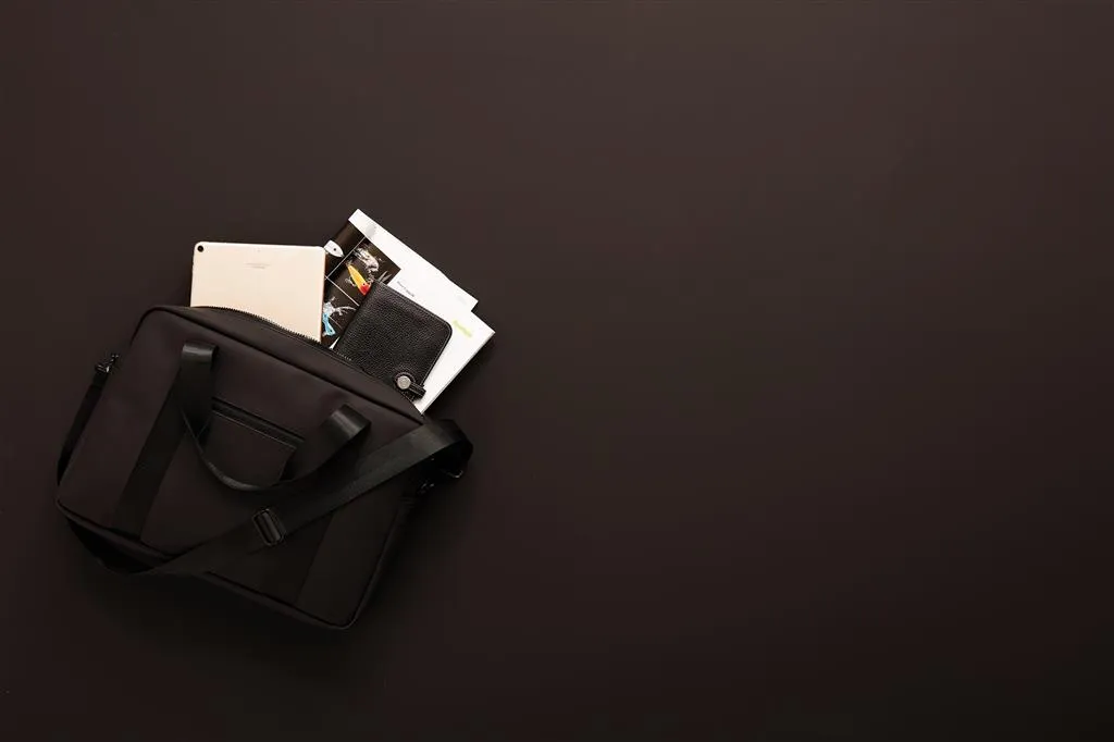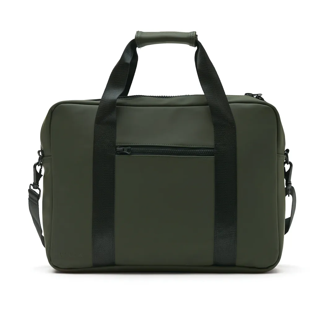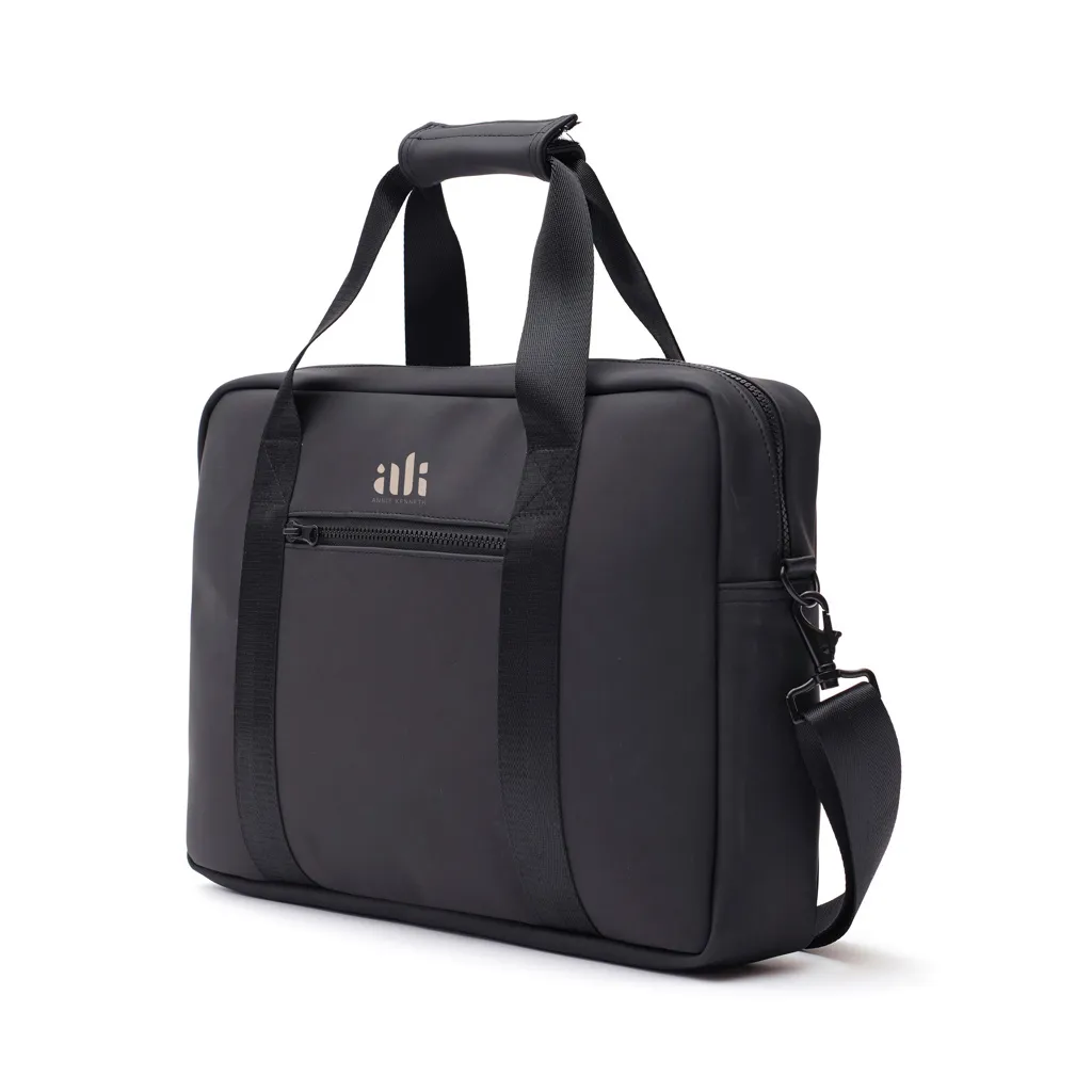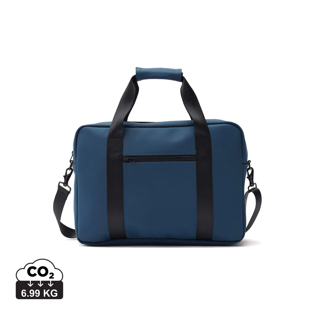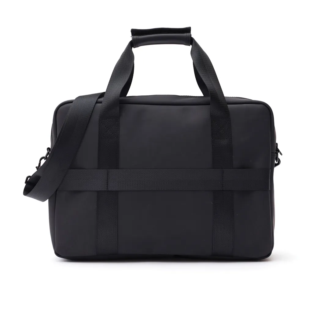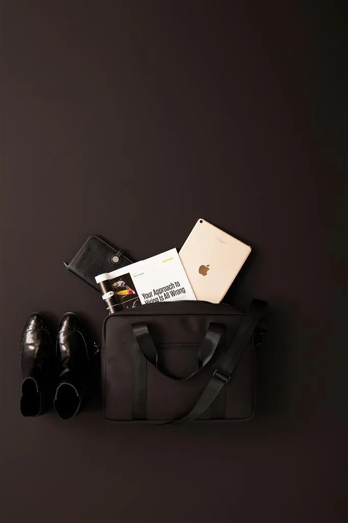 Modern and clean design computerbag. Functions and form comes together, besides the ordinary computer pocket this bag also has place for pens, documents and other belongings. The bag is produced in a water repellent material, with both shoulder strap and carry handles. It also includes an attached band on the backside, so it fits your trolley when travelling.