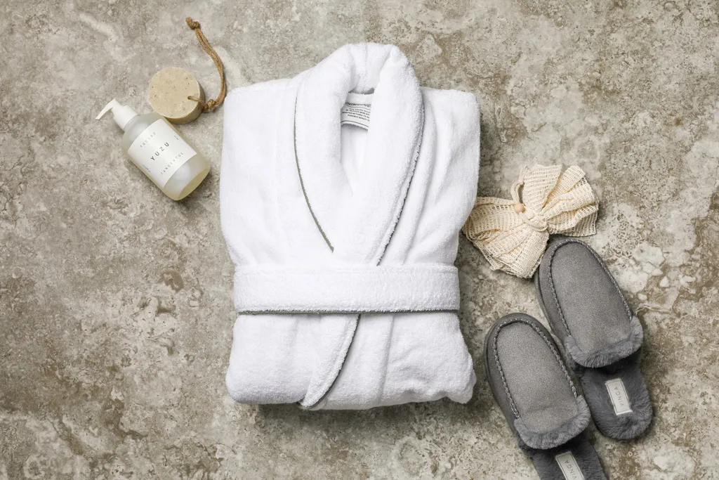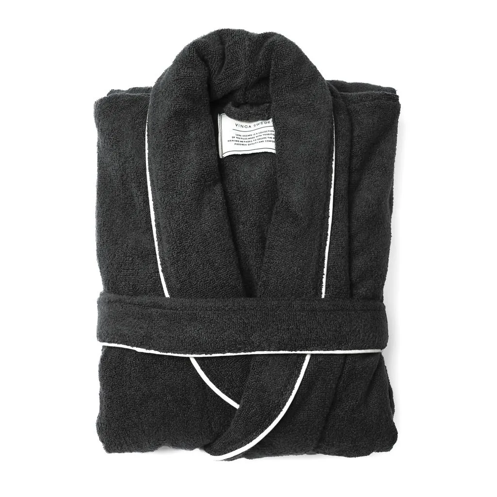 Luxurious robe in 100% cotton. The robe is a classic model with an extra wide collar and belt at the waist. It also has several nice details, such as enclosed seams and contrasting piping on the collar. Made of a long cotton fibre with untwisted threads. The result is an incredibly soft robe that you'll never want to take off.