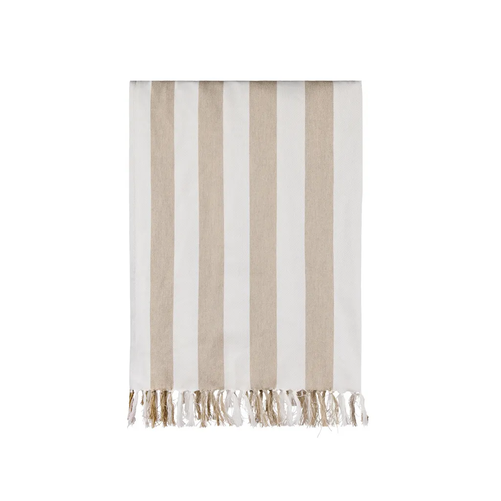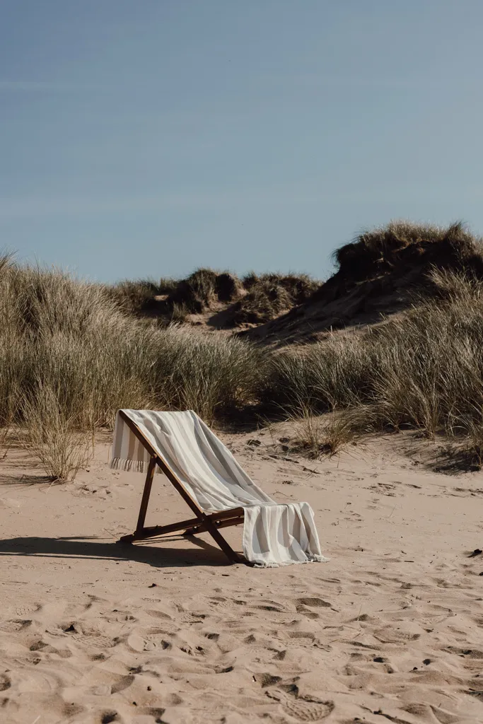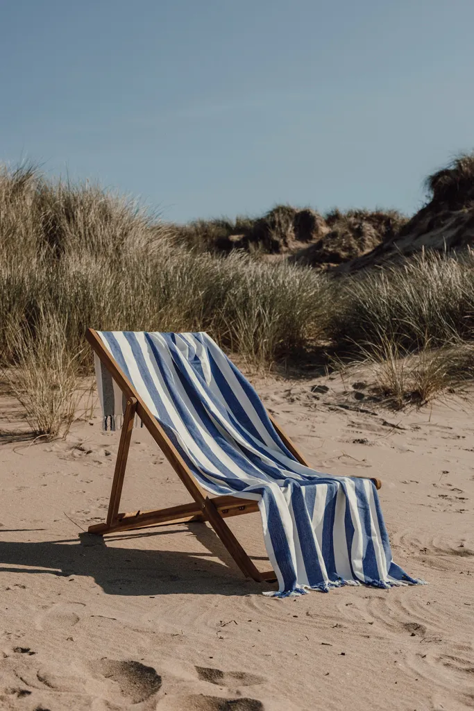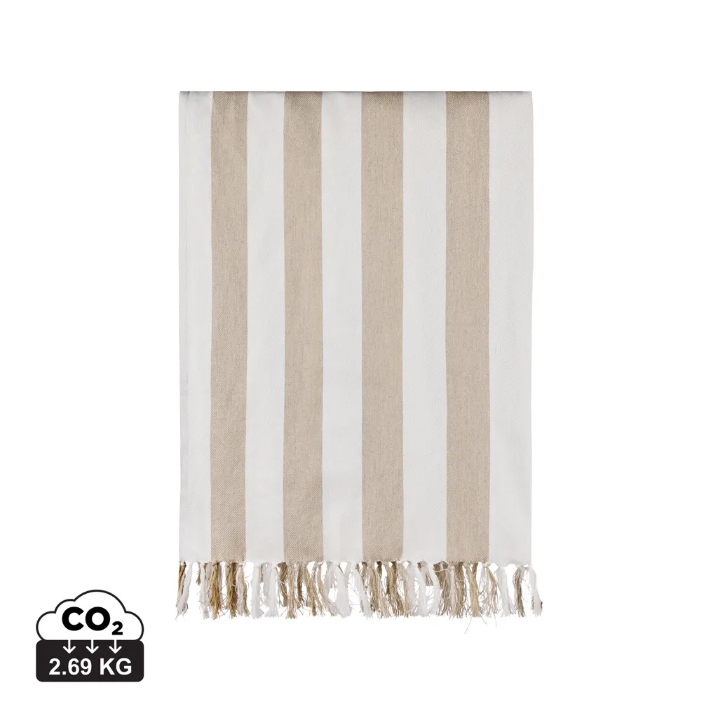 This hammam beach towel features a classic two-coloured striped pattern with fringes on the short sides. Crafted from a lightweight and airy 200 gsm blend, it combines the comfort of cotton with the quick-drying benefits of polyester. Measuring 80x180 cm, it is perfect for the beach or poolside. Certified by GRS (Global Recycled Standard), GRS certification guarantees that the entire supply chain of the recycled materials is certified. The total recycled content is based on the overall product weight. This product contains 68% GRS certified recycled cotton and 29% GRS certified recycled polyester.
