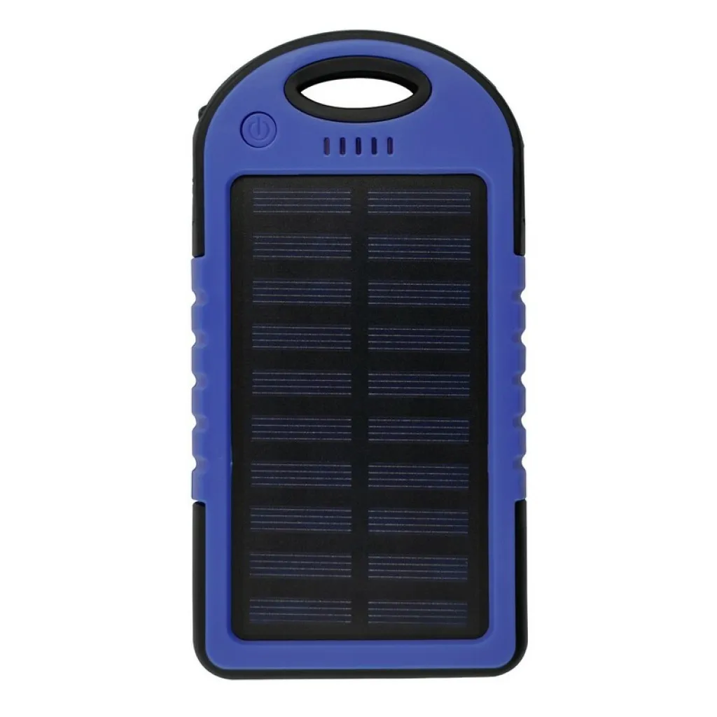 Water resistant 4000 mAh power bank with solar panel for recharging, on/off button, emergency LED light, 4 electric charge indicators, 1 solar charge indicator, 2 USB outputs for charging two devices simultaneously, input 5V/1A, output 1: 5V/1A, output 2: 5V/1A, micro USB cable and carabiner clip included