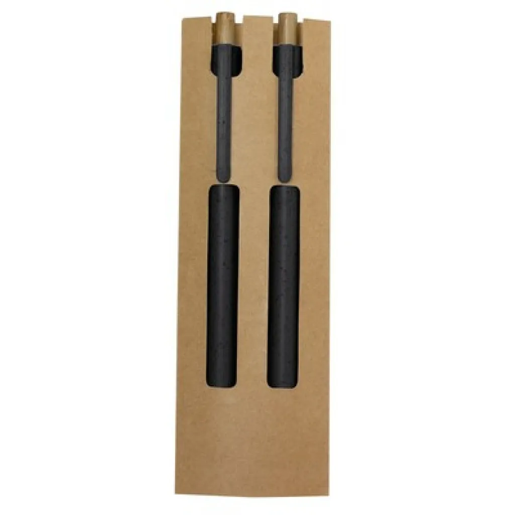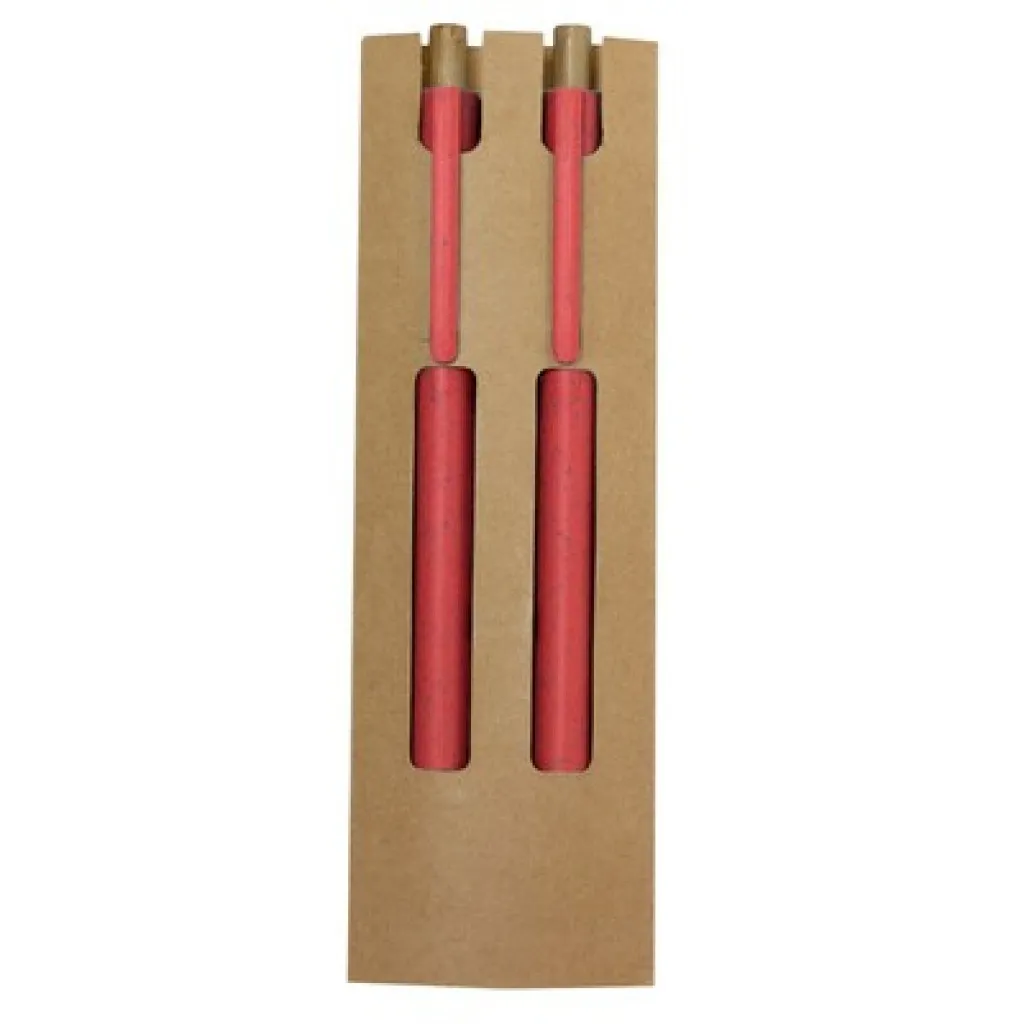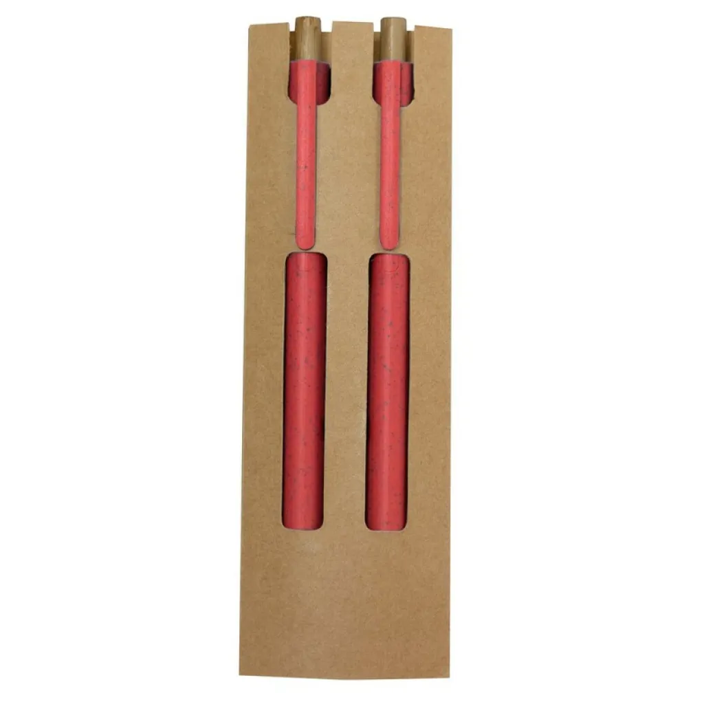Set of pen and eternal pencil made from wheat straw and bamboo. Pen with push mechanism made from bamboo with blue ink and matching clip. And pencil with push mechanism made from bamboo featuring an eternal tip, allowing the use of the same pencil without generating waste. Presented in a recycled cardboard case. With printed wheat straw label.Made from plant-based materials to promote the use of natural raw materials and reduce contaminating emissions.