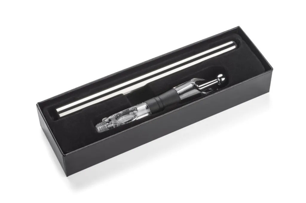 This product is a real treat for wine lovers. It has lots of usefull functions: thanks to a special filling it keeps a proper temperature of a wine, it airs the wine so that you can feel it's best flavor, you can keep all aroma inside of the bottle thanks to a closable stopper. A detachable colling filling should be kept in a freezer before using. All elements are packed in an elegant black box.