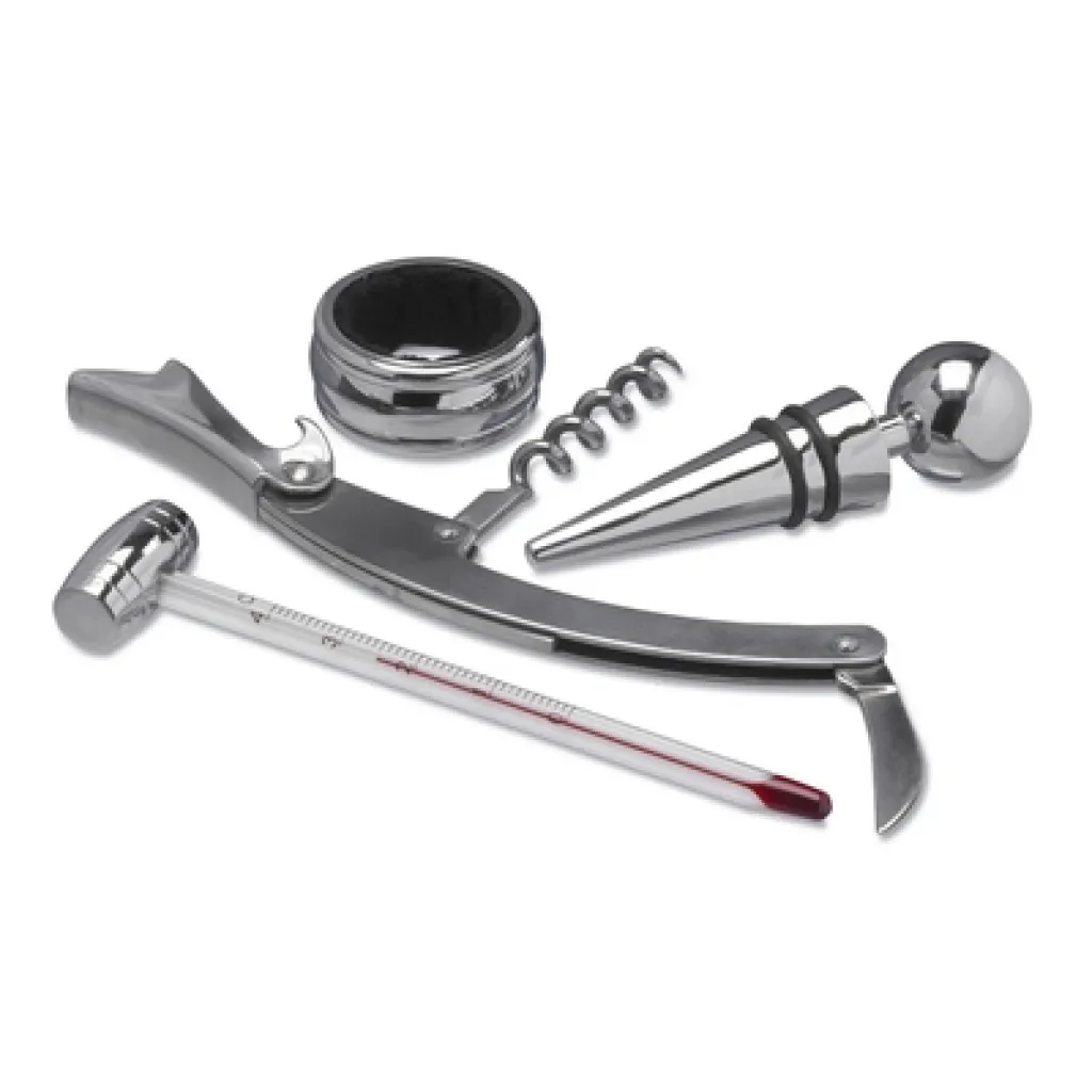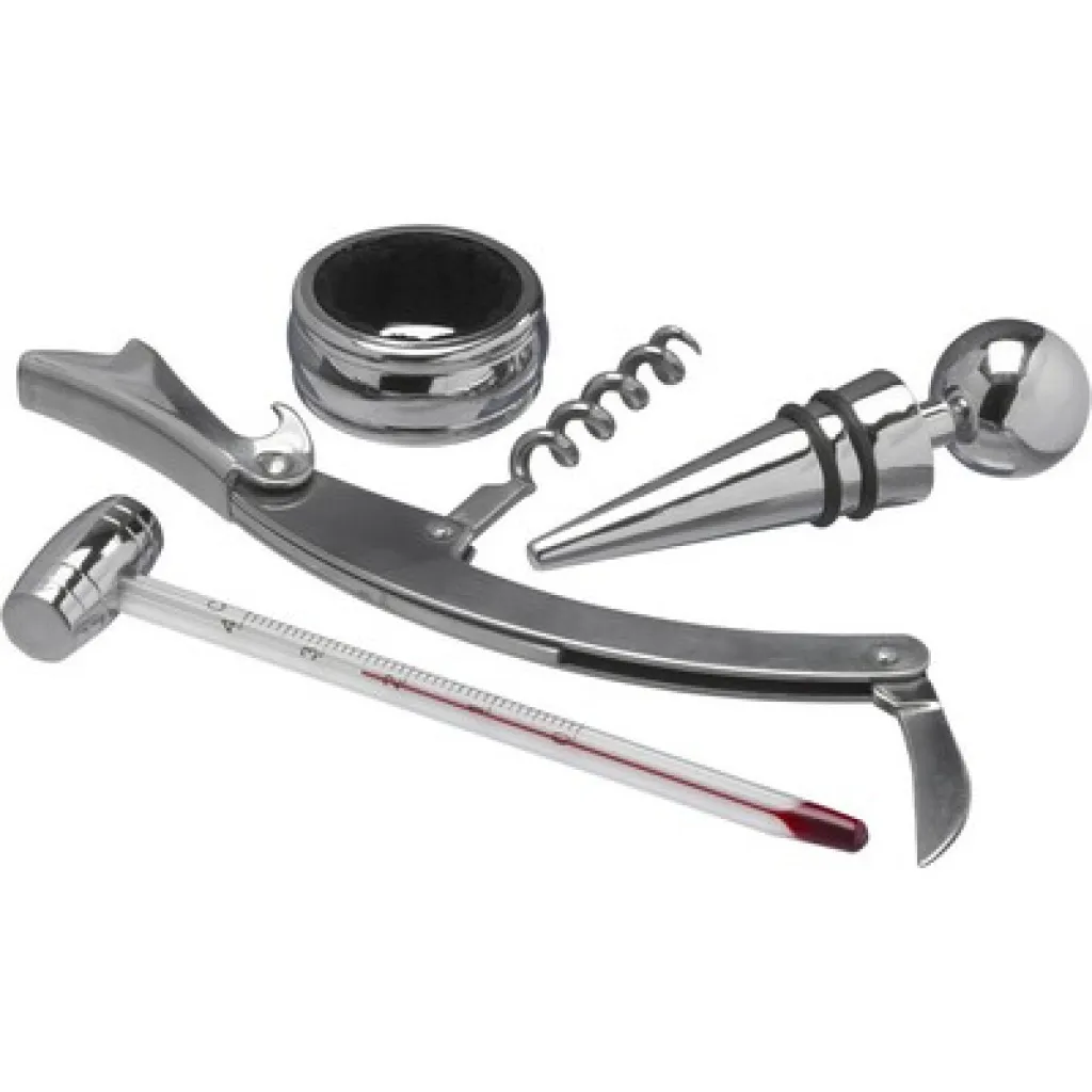 Wine set 4 pcs in wooden box, wine accessories: waiter's knife, ring, wine stopper, thermometer