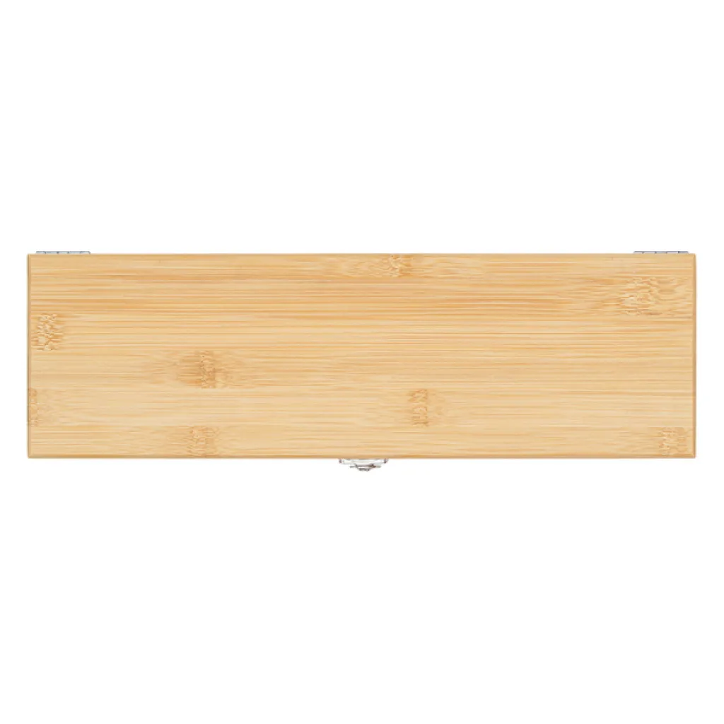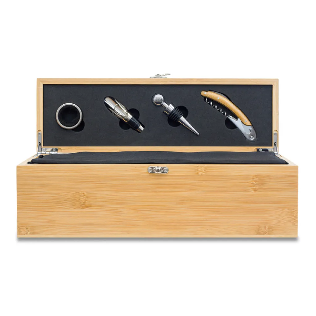 Fabric-lined bamboo wine box. The set also includes: wine corkscrew opener, bottle drip collar, stopper, pourer with a closure.