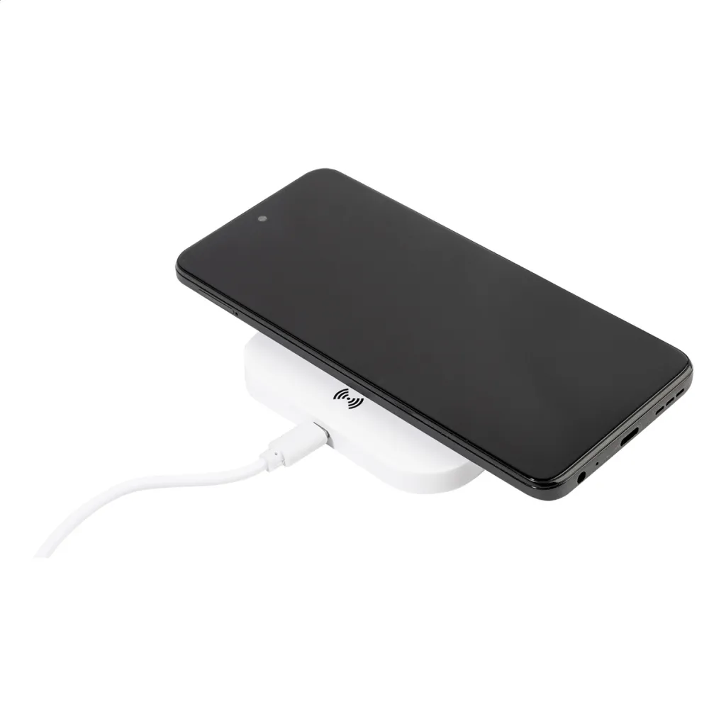 Plastic wireless charger with 2 USB ports. Max output 2100 mA.