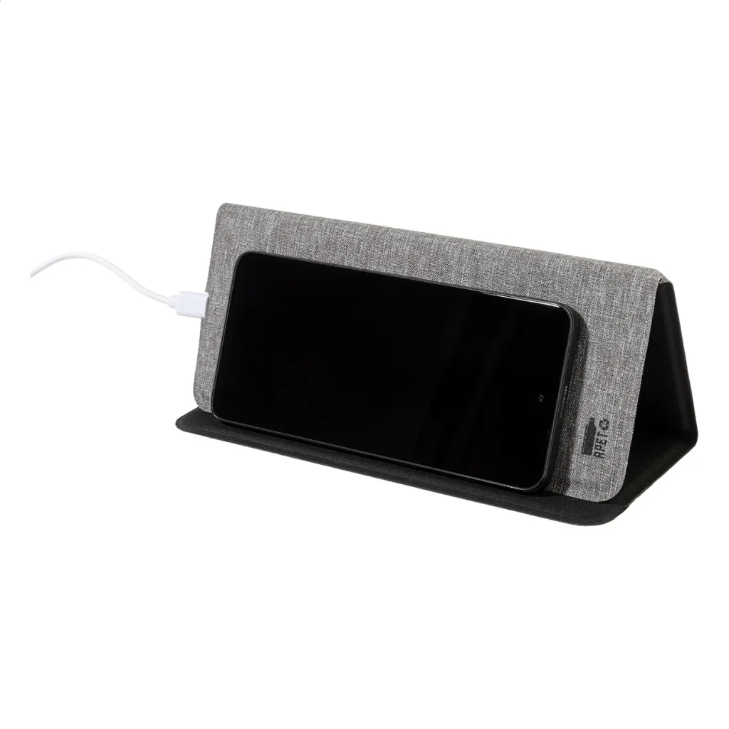 RPET polyester mouse pad with built-in wireless fast charger (10W) and mobile phone holder functions. Including USB charger cable.
