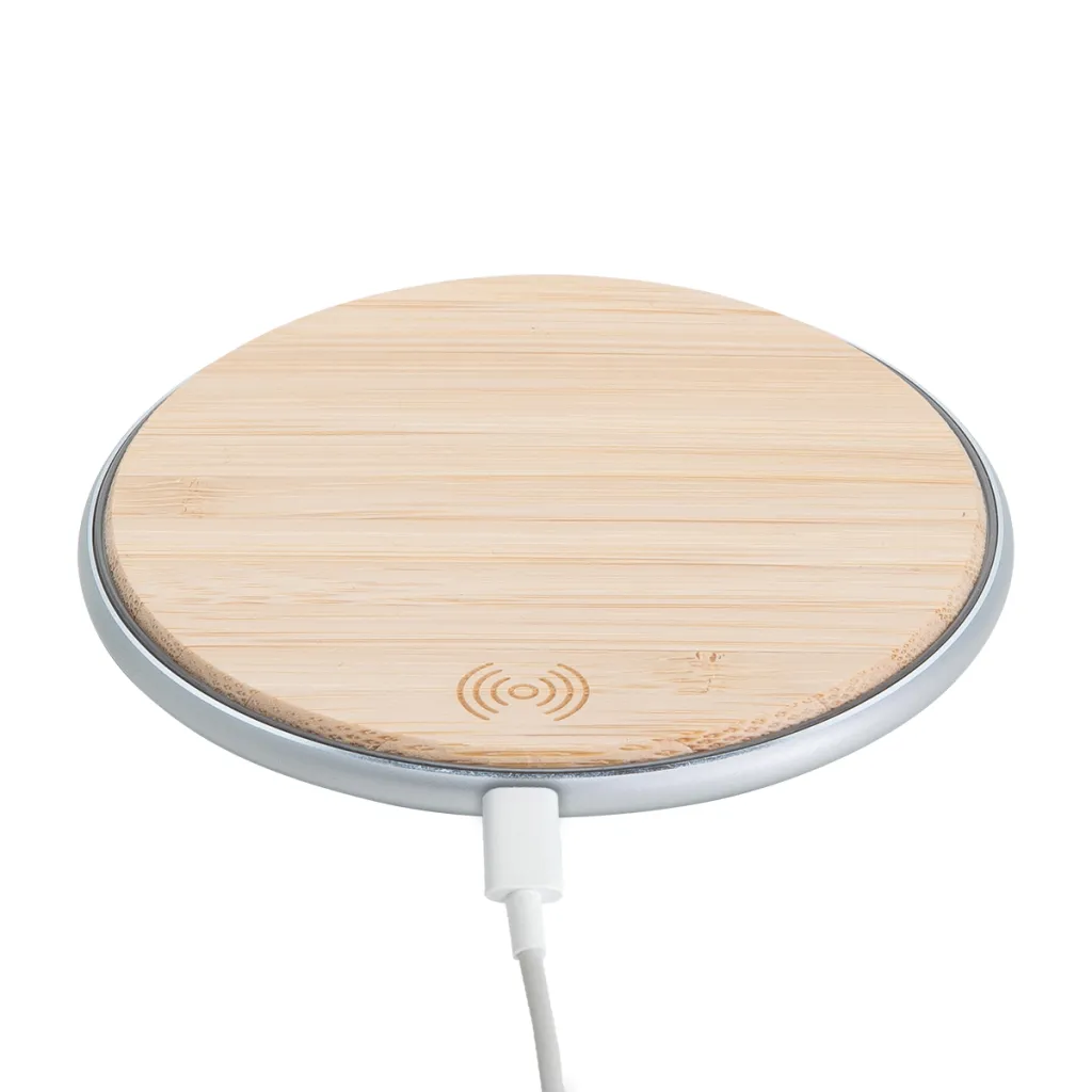 Qi Standard wireless charger with bamboo cover. Maximum charge power of 10 W. Cable included.