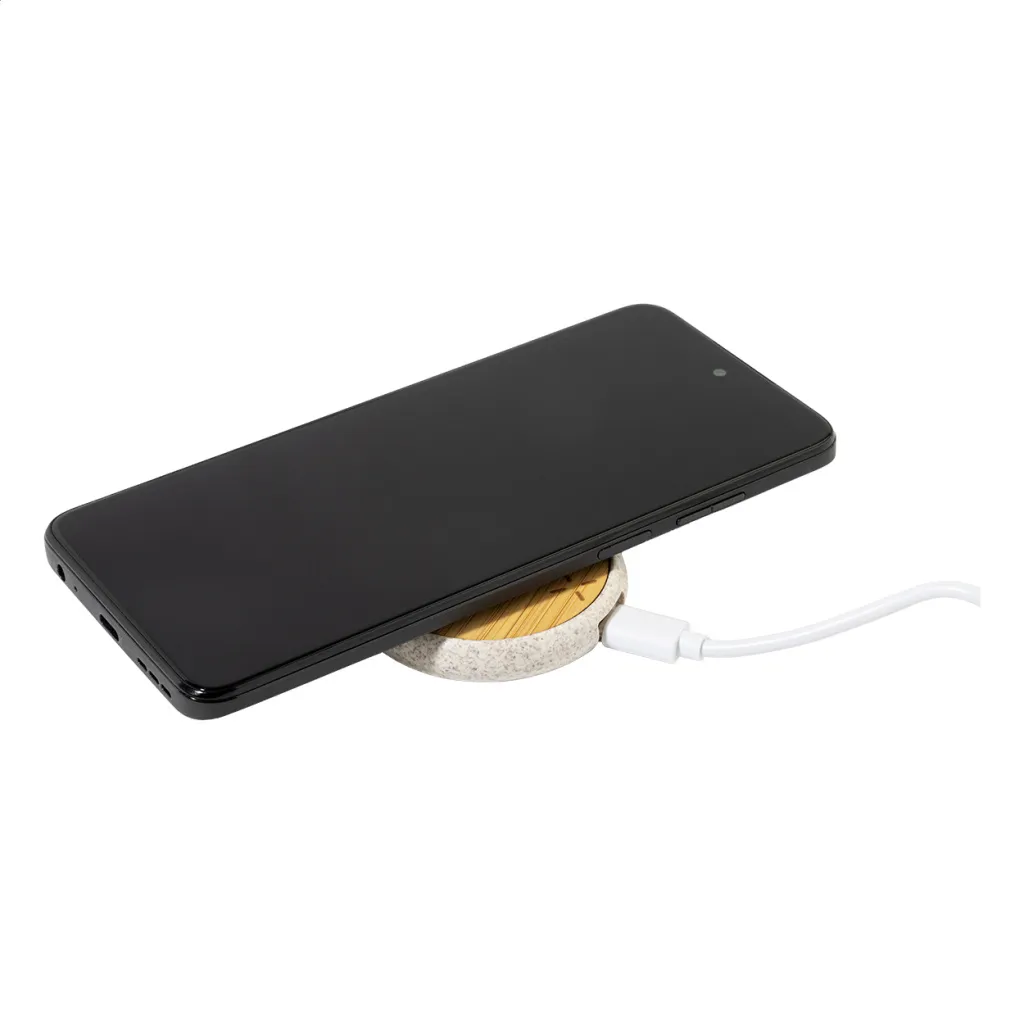 Wireless charger in bamboo and ecological wheat straw plastic housing. Max. output: 1000 mA. Including USB cable.