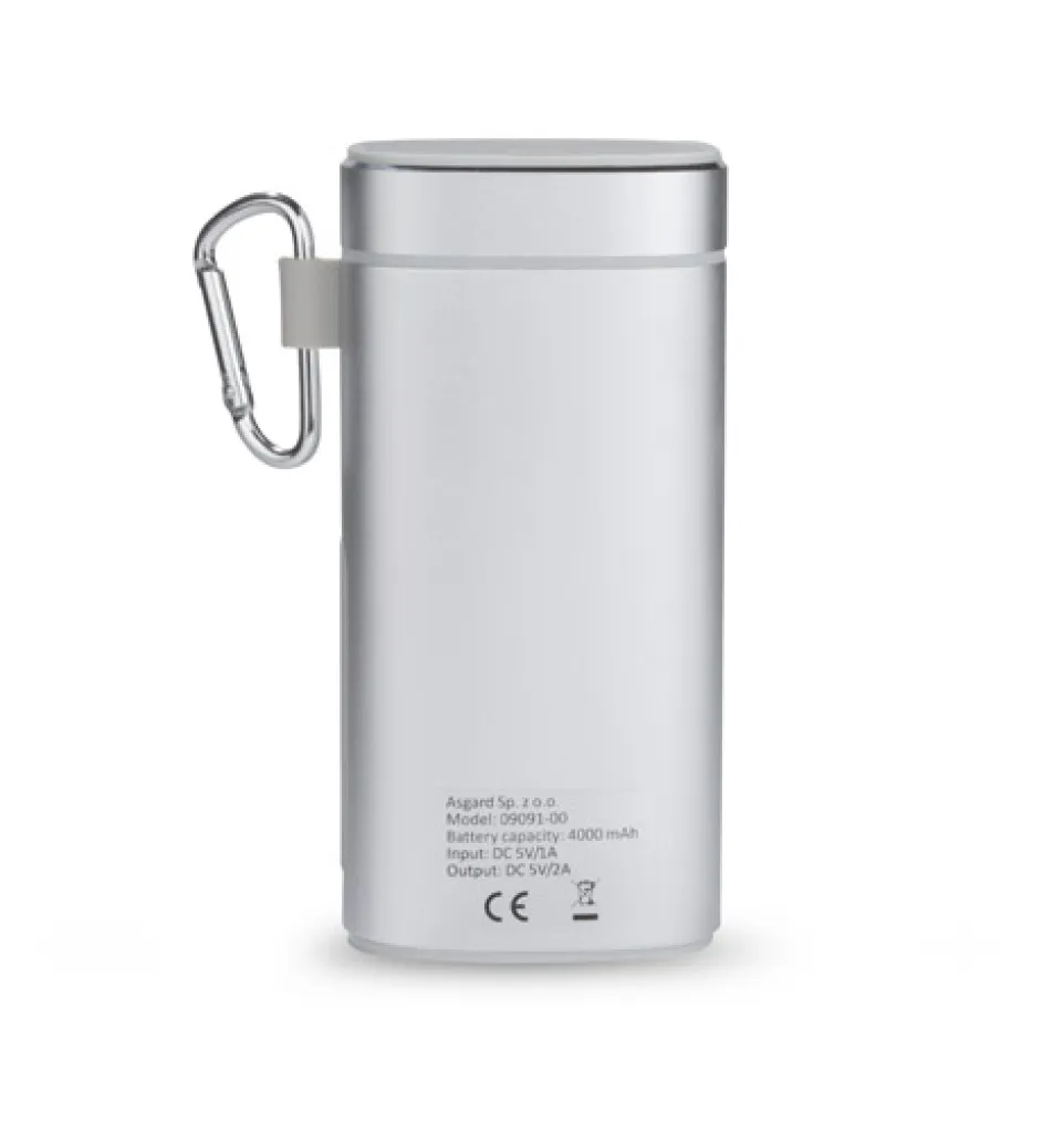Elegant wireless speaker with 4000 mAh power bank is a great gift for gadget lovers. It is made of metal which makes it durable and an engraved logo will look good on it. The speaker can be used as a hands-free set. Music can be played via Bluetooth (Version 4.2), audio cable with 3.5mm jack (not included) or micro SD card. In addition, it offers IPX4 waterproof class, i.e. total protection against sprinkling and splashing with water from various directions with intensity up to 10 litres per minute. It is ideal for tourists and in every day use e.g. under light rain. The product complies with relevant European Union Directives, has a CE marking and a 1-year guarantee. Micro USB charging cable and carabiner included. Technical specifications: - input: 5V/1A, - output: 5V/2A, - lithium-polymer battery, output power: 5W x 1, 3D stereo effect and bass boost, Voltage: 5V S/N ratio: ≥ 80 dB, working time: 10-15 hours