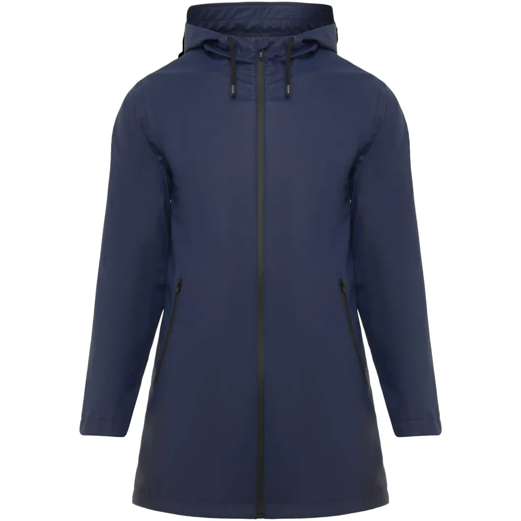 Waterproof raincoat for women. Hood with peak. Heat-sealed zips and seams. Contrasting details in black. Two side pockets with zip. Slit on back hem. Removable label. Waterproof. The model is 179 cm and is wearing size S.