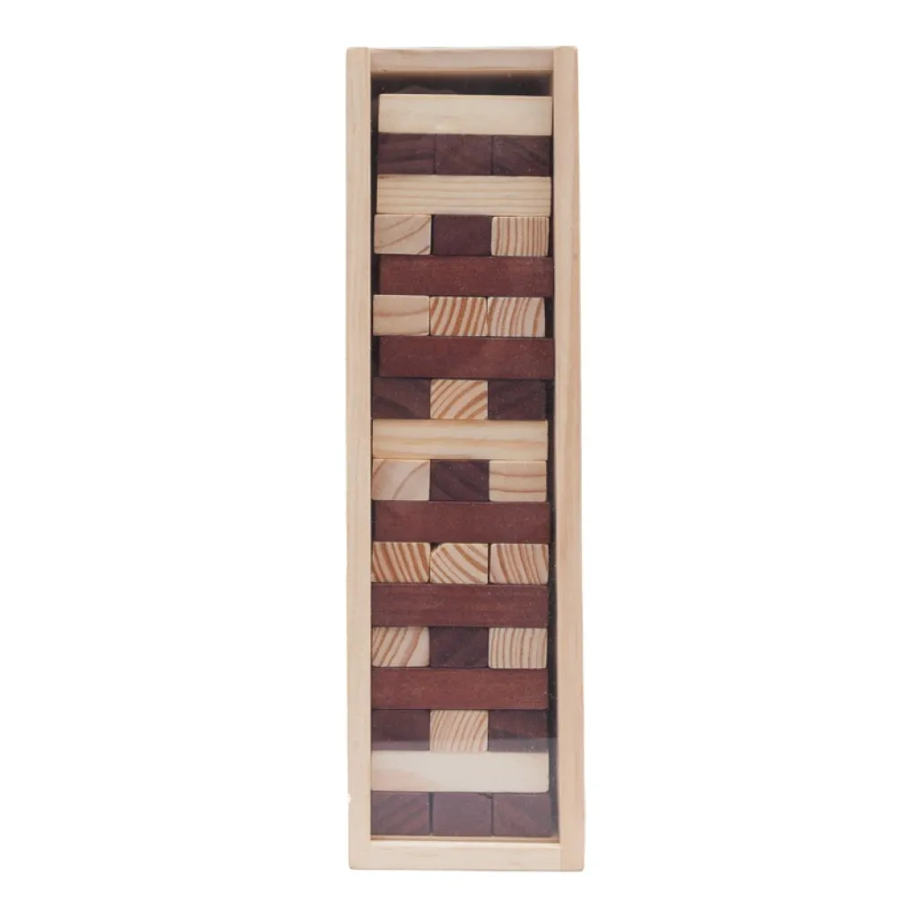 Playing wood for practicing skills. Packed in a wooden retractable box. From the tower, the dice is taken by the dice one by one until the tower falls.