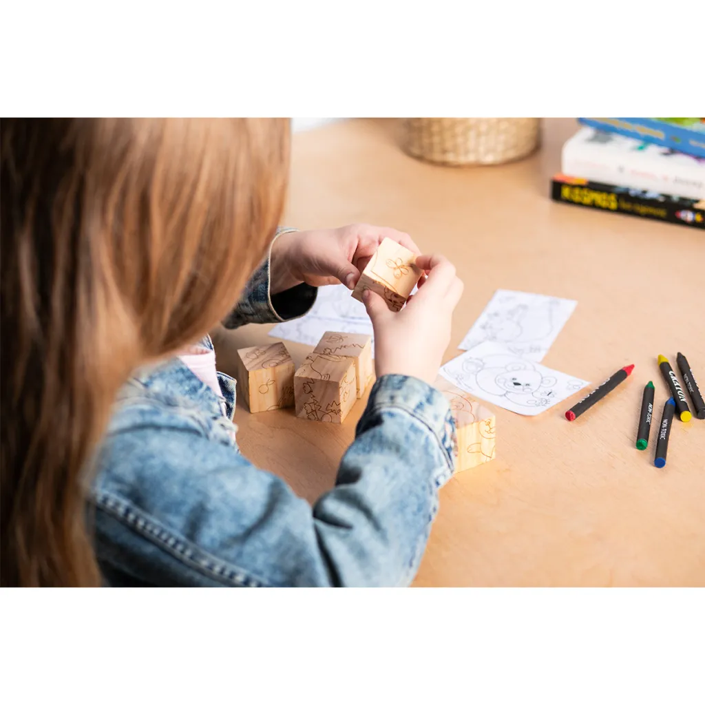 Wooden Puzzle. Traditional, educational toy for children. The set consists of 6 blocks and six pictures showing forest animals.