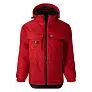 Jacket, high collar with hood, elastic cuffs around the sleeves with Velcro to adjust the width of the sleeves, back panel longer than the front, fully zippered, three chest pockets with flaps, two big pockets with covered zip, one pocket inside, zipper on the inside back for easier printing access.