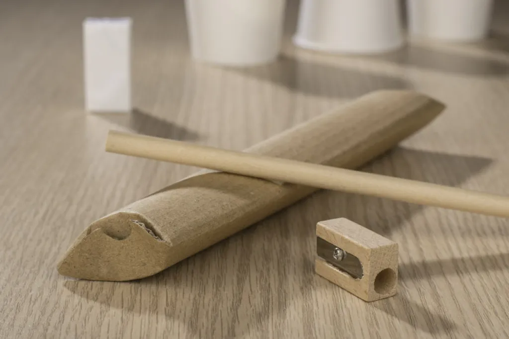 Ecological-friendly set consisting of a wooden pencil, a sharpener and a rubber All packed in a cardboard box. Logo can be pad printed or engraved.