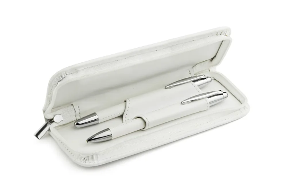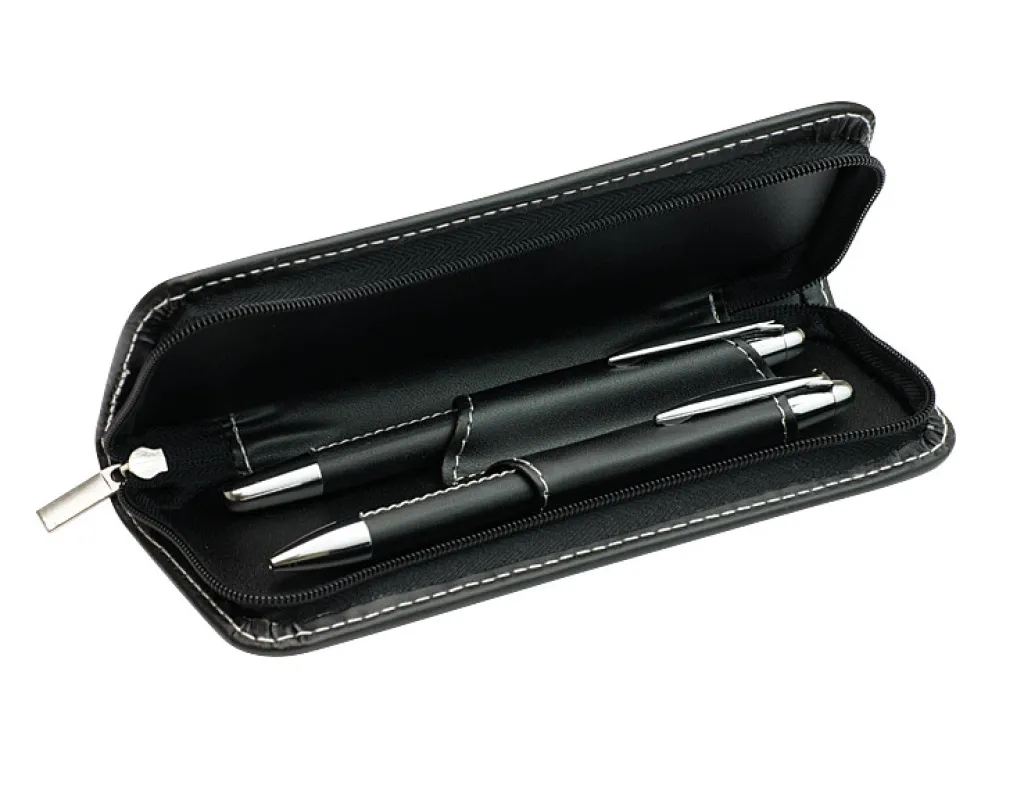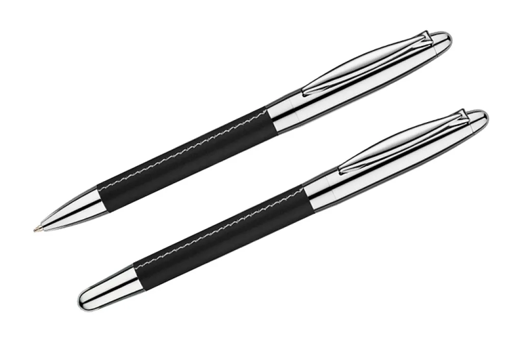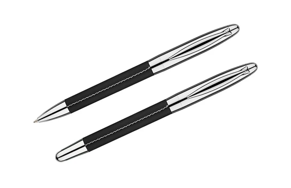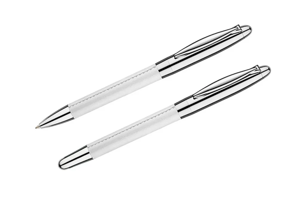 Writing set: ball pen and roller pen packed in case made of PU. Ball pen and roller pen with blue refill. Logo can be engraved on the ball pen and roller pen.