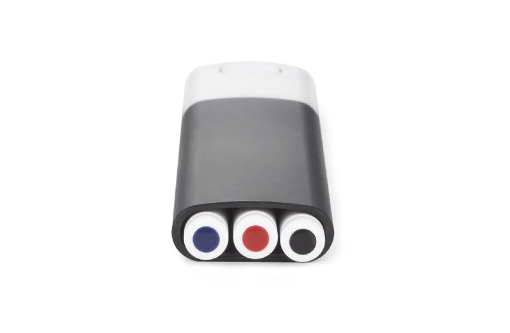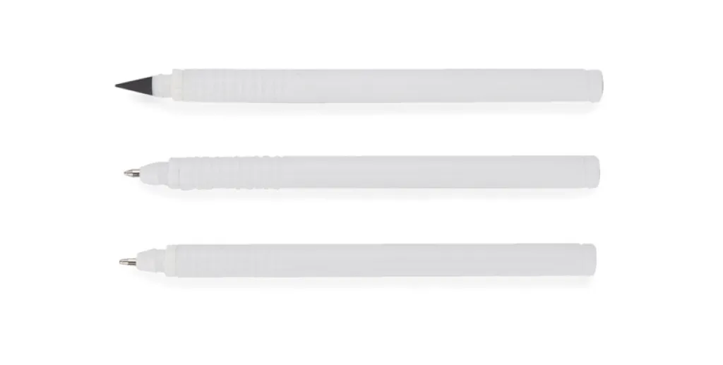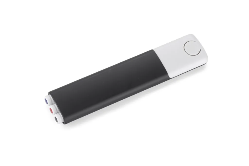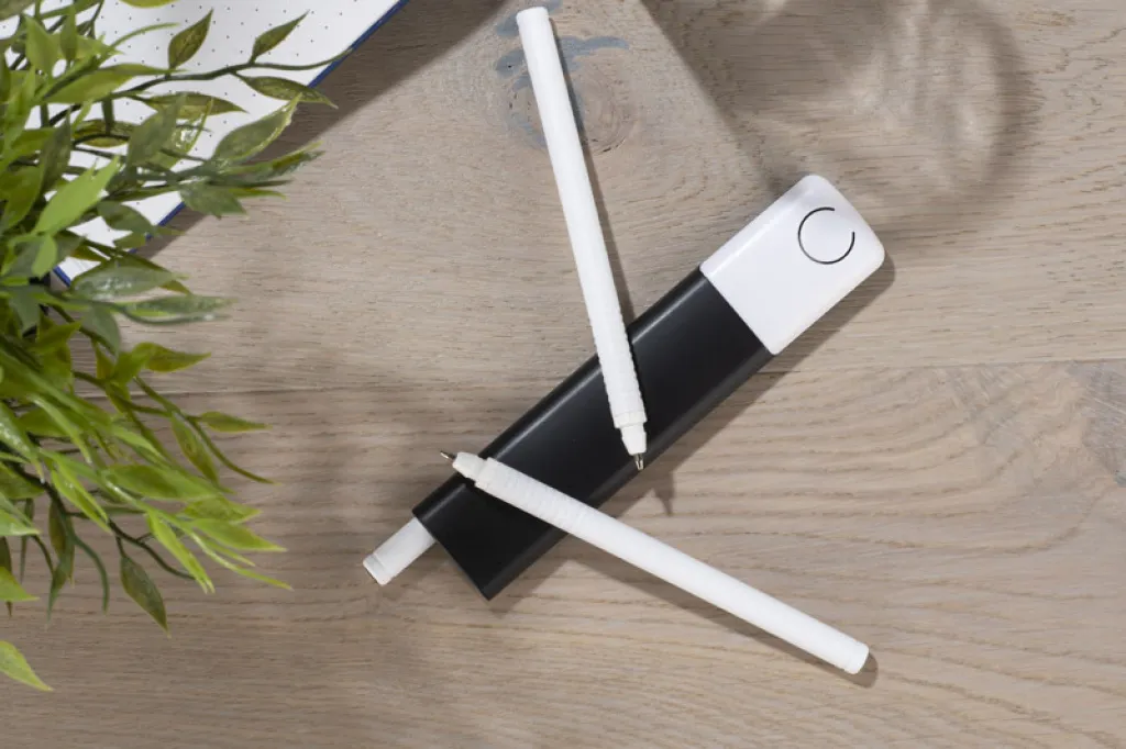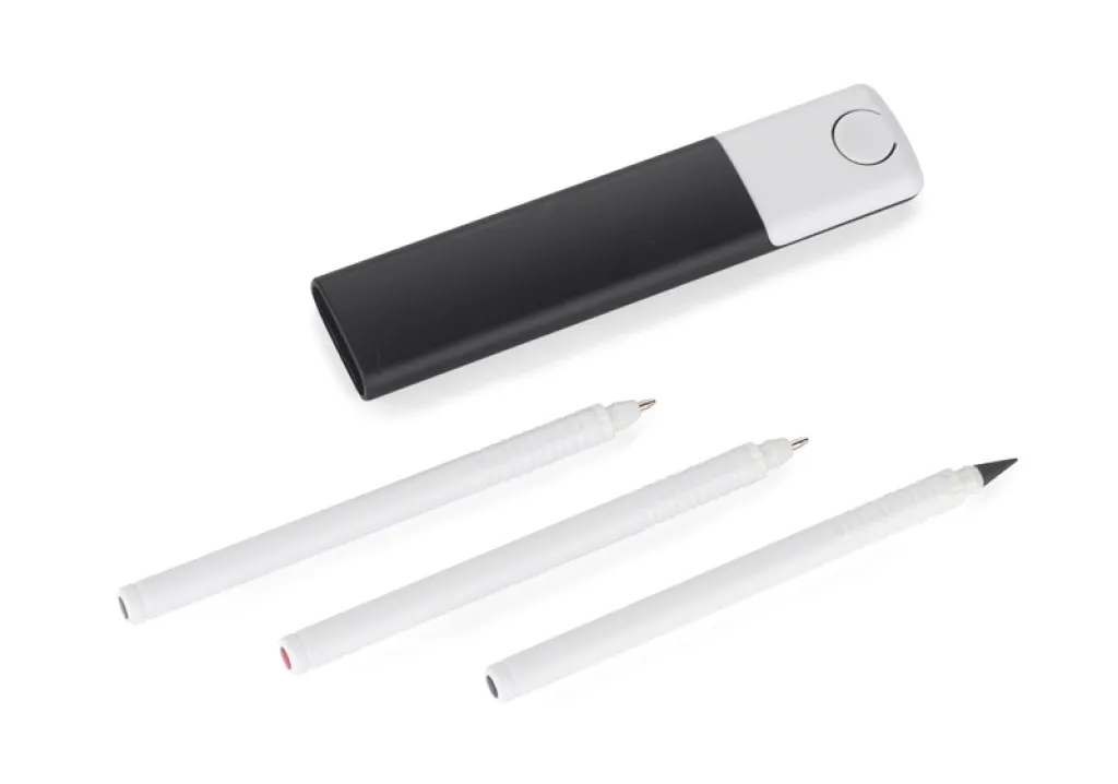 HOP is a practical writing set containing the necessary accessories packed in an innovative plastic case. The pens placed inside are held by a special mechanism that prevents them from falling out. Pressing the button at the bottom of the case releases the lock and allows you to remove the pens. The set includes a blue pen, a red pen and a fountain pencil that does not require sharpening. The whole thing is made of plastic, thanks to which the set is extremely light. HOP is the perfect gift for teachers, students and students that will fit in any purse and backpack