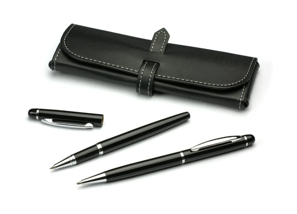Elegant pen set packed in a case of eco-leather. The set includes a ball pen and a rollerball pen. Logo might be engraved on the surface of stationery or on the case.