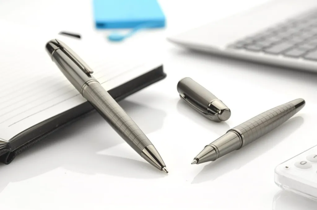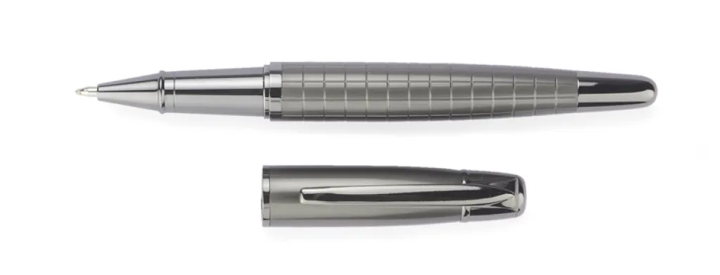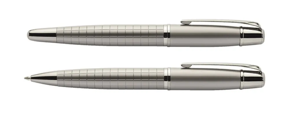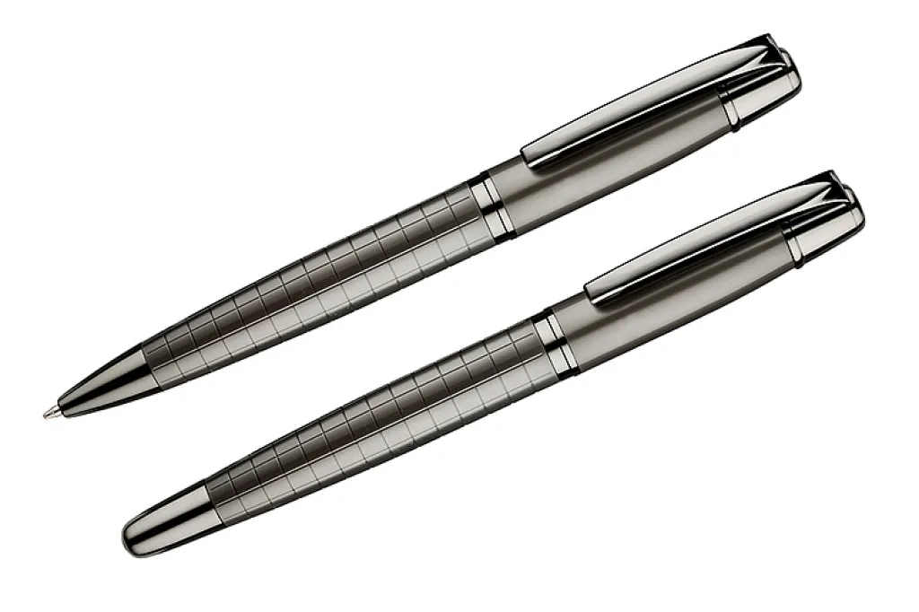 Elegant writing set of luxury brand GESSTOR that stand out with high quality and unique design. Black case contains ball pen and a roller pen. Both elements are made of metal with interesting texture and are marked with GESSTOR brand logo at the endings. Marking can be placed on ball pen, roller pen or on the case.