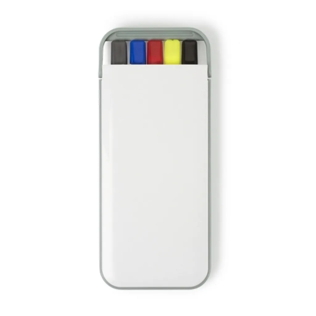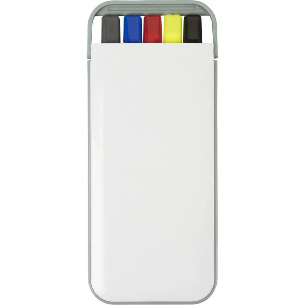 Writing set in plastic case, pencil, highlighter and 3 ball pens with caps that indicate ink colour