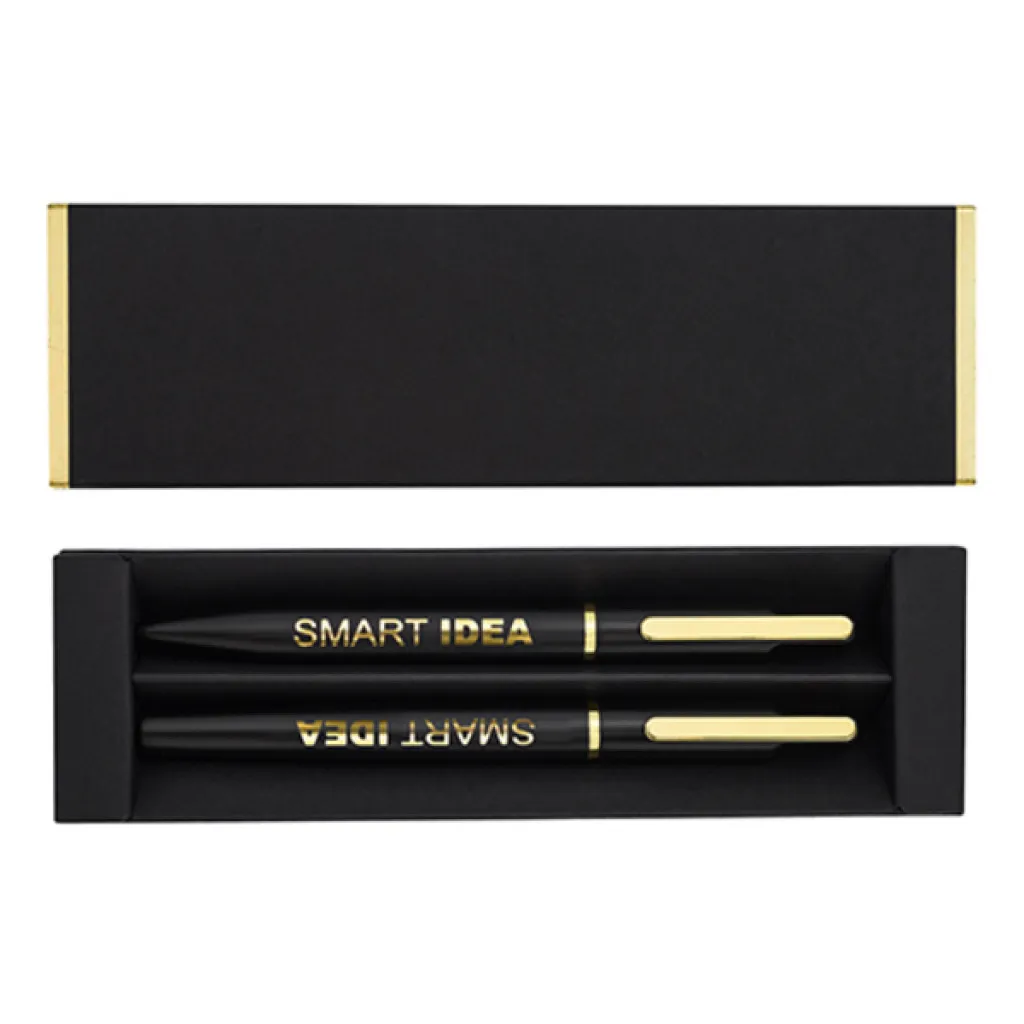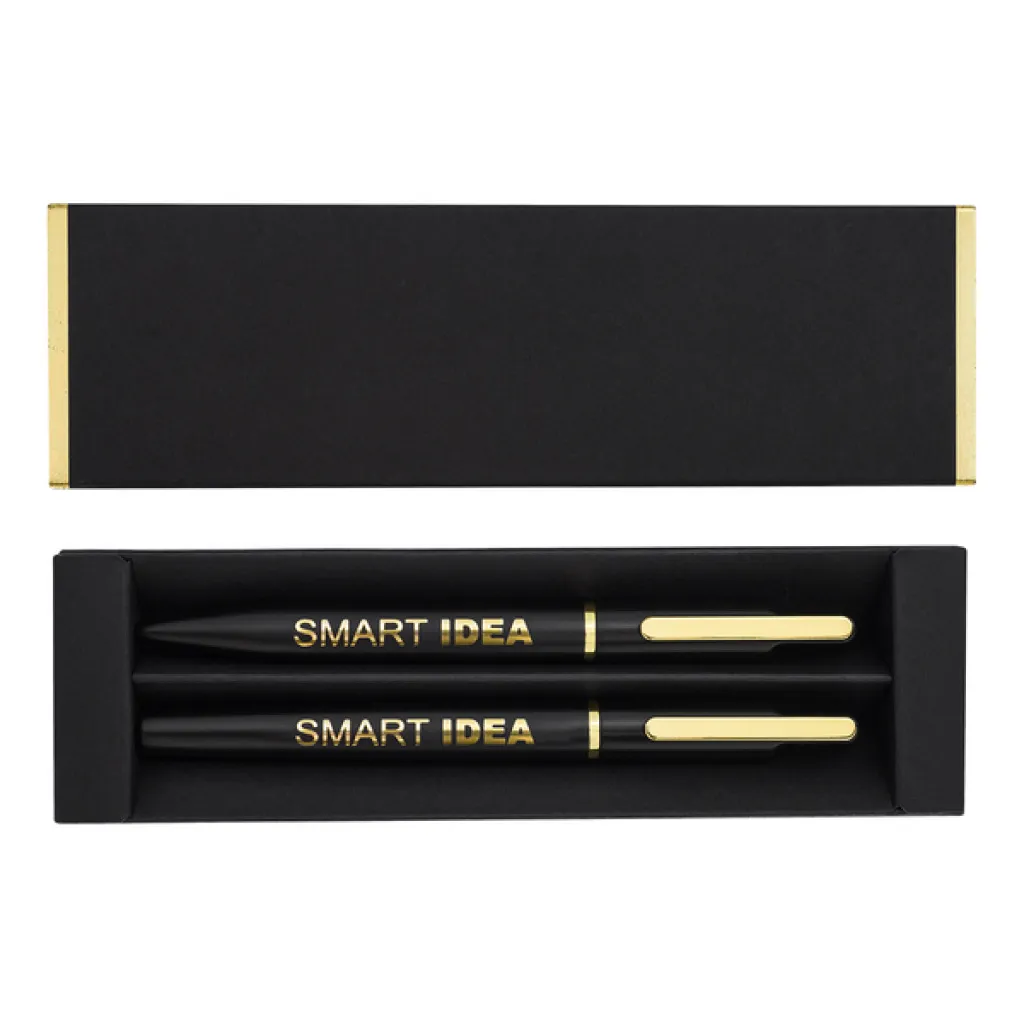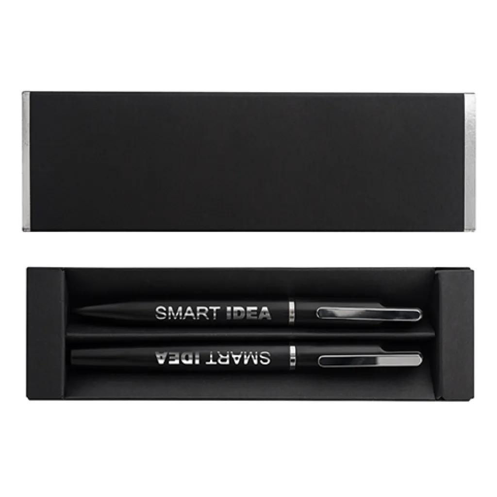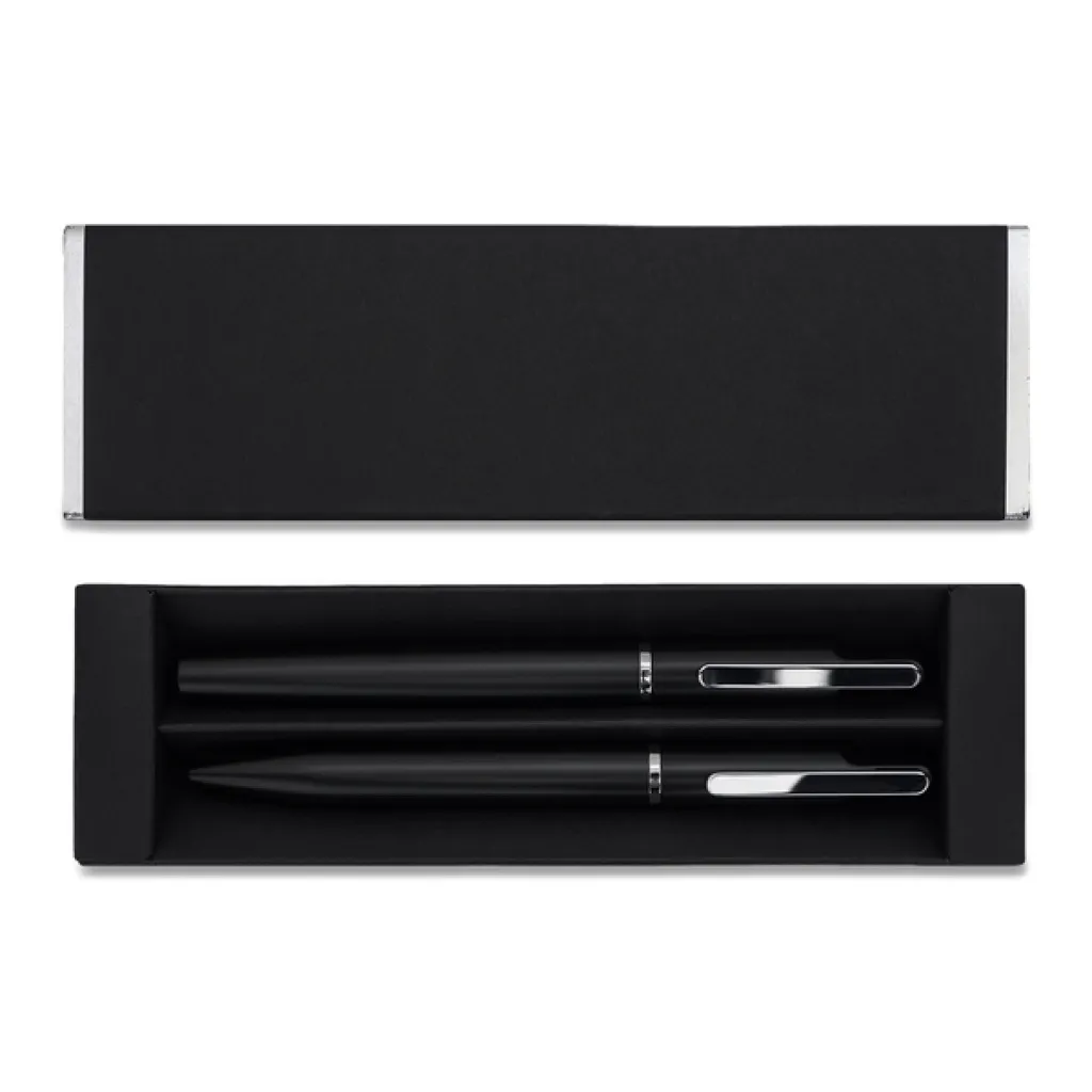 An elegant gift set consisting of a metal ballpoint pen and a rollerball pen. Possibility of engraving a shiny logo, matching the color of the metal details of the pen. Blue refill.