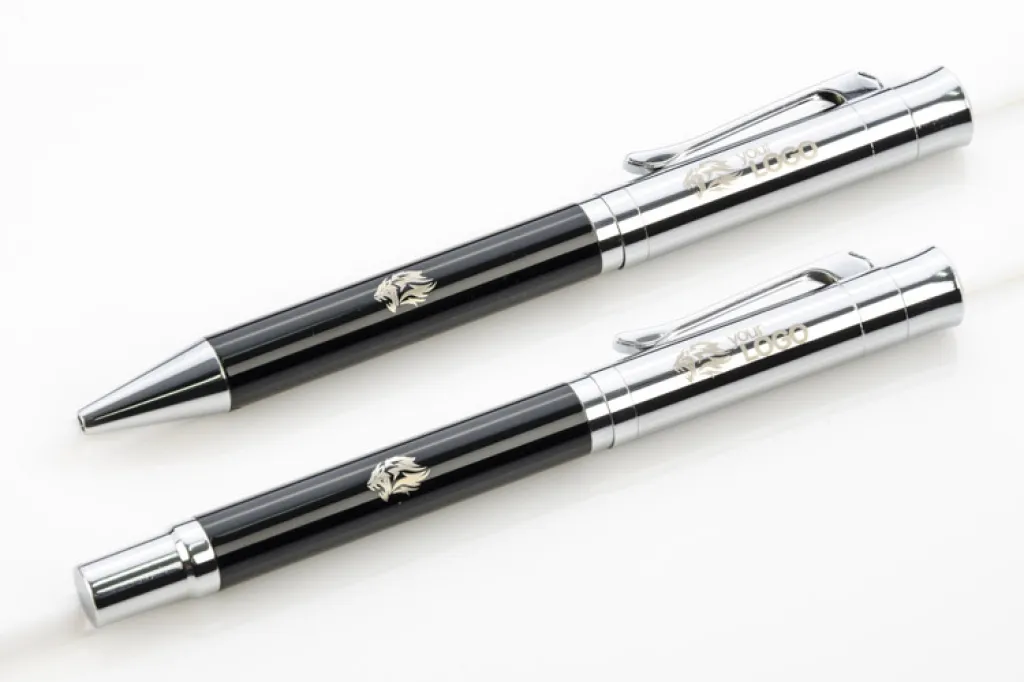 WASHINGTON writing set contains a metal ball pen and roller pen in a case made of eco-leather. The case is white. Logo might be engraved on the ball pen or the roller pen.