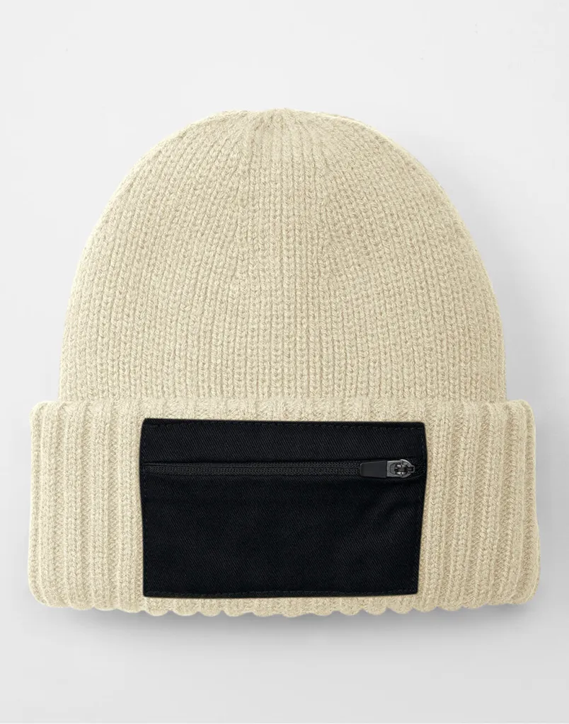 ·50% Recycled Polyester, 50% Acrylic ·Chunky double layer knit ·Engineered crown for maximum comfort ·Cotton twill patch for decoration ·Zippered front patch pocket