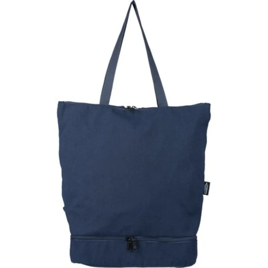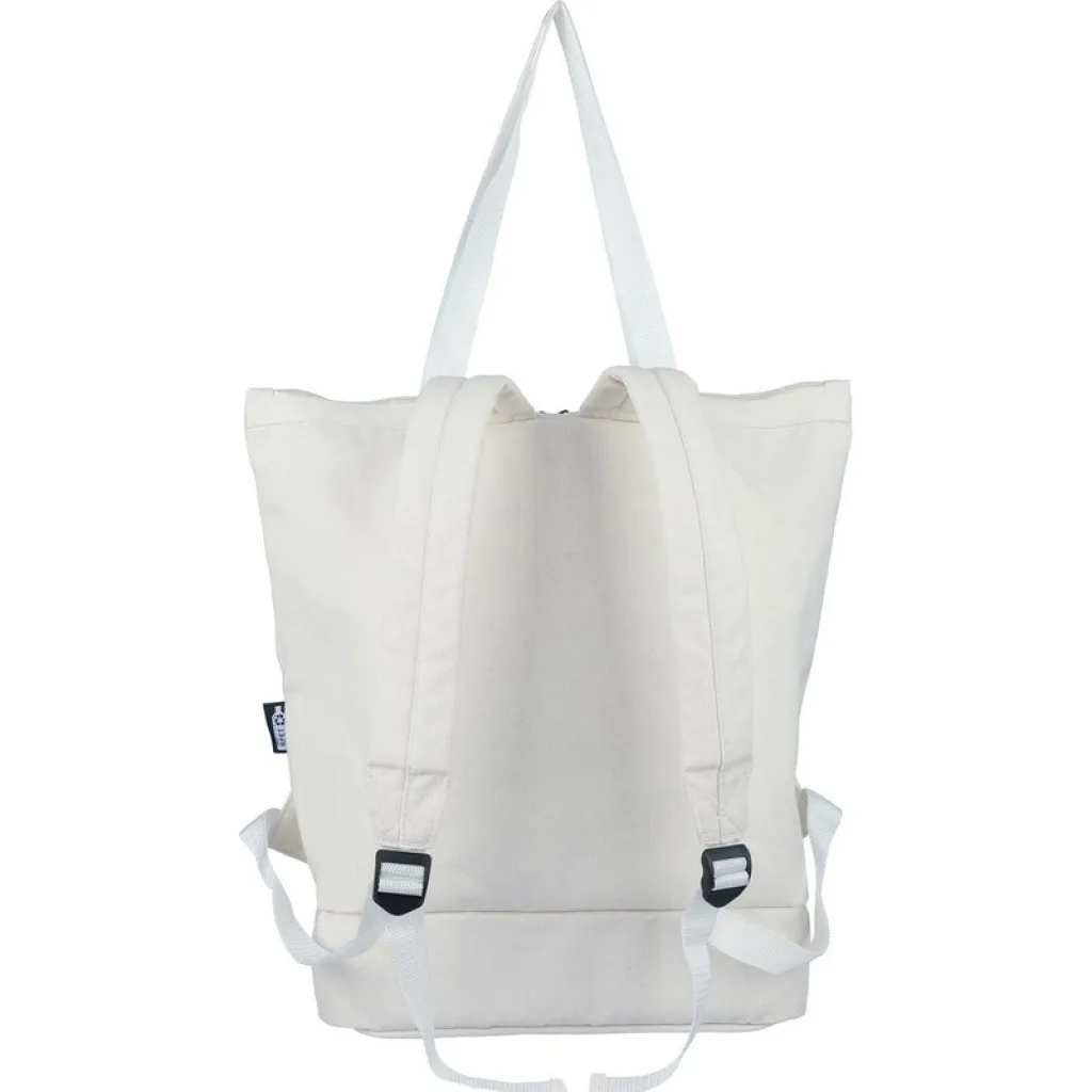 Ruksak s funkcijom torbe za rame, sadrži veliki džep s patentnim zatvaračem na vrhu, džep s patentnim zatvaračem na dnu, pretinac za laptop veličine 15", dva unutarnja pretinca, jedan vanjski džep s patentnim zatvaračem. Dizajn uključuje duge ručke za nošenje i podesive podstavljene naramenice. Kapacitet: 30 L, nosivost: 15 kg. Proizvod je izrađen od recikliranog polikotona (330 g/m²) s podstavom od 210D poliestera.