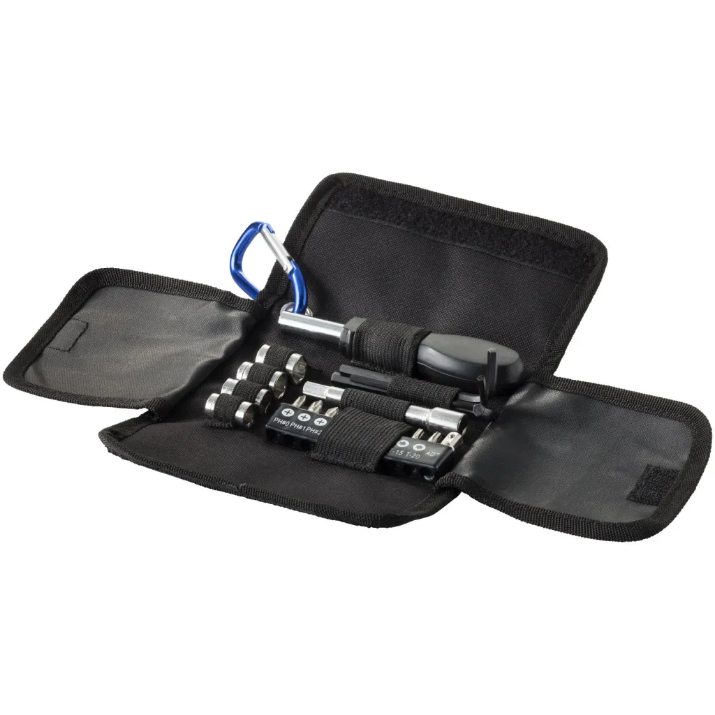 Mali, sklopivi set alata od 19 dijelova s karabinerom za jednostavno spremanje. Set sadrži: 4x gedore (7-8-9-10mm), 1x odvijač, 10x bitovi odvijača, 1x produžna šipka i 3x imbus ključa (3-4-5mm).