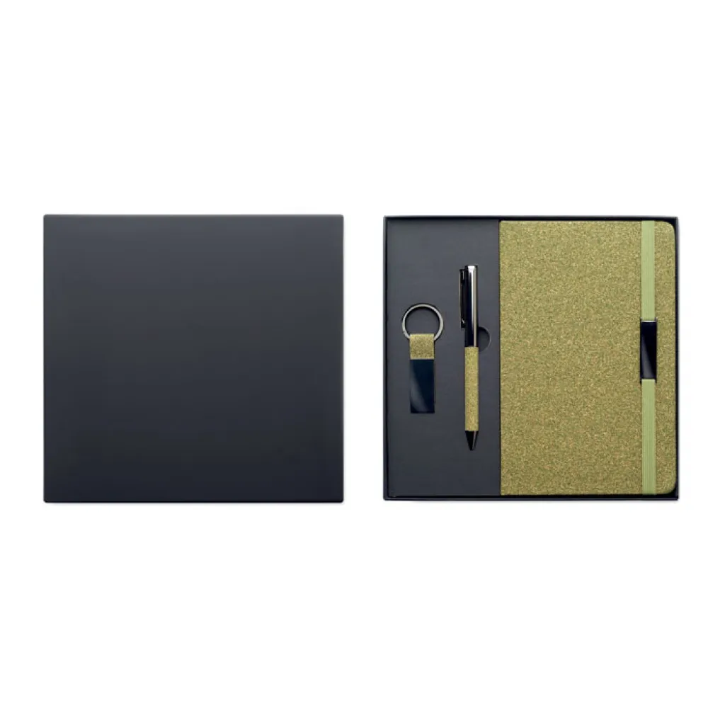 Set notes A5 formata s tvrdim koricama, 160 stranica od recikliranog papira s crtama (80 listova/70 g/m²), metalna kemijska olovka s okretnim mehanizmom i privjesak za ključeve. Detalj izrađen od 20% mljevenog čaja, 30% pluta, 50% polipamučne tkanine. Metalni detalj na elastičnoj traci. FSC®-certificirano | FSC MIX CREDIT, N7.1, FSC-C213206.