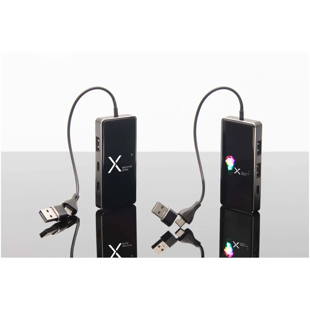 8 u 1 USB hub s 3x USB-A- i 3x tip C priključka za povezivanje do 6 uređaja u isto vrijeme. Zahvaljujući dvostrukom USB-A + USB-C ulazu, kabel je 100% kompatibilan s najnovijim računalima na tržištu (USB-C). Ovo USB čvorište ima gumenu završnu obradu i svijetleći logotip. Isporučuje se u poklon kutiji od recikliranog kartona (14,6 x 7,3 x 2,5 cm).