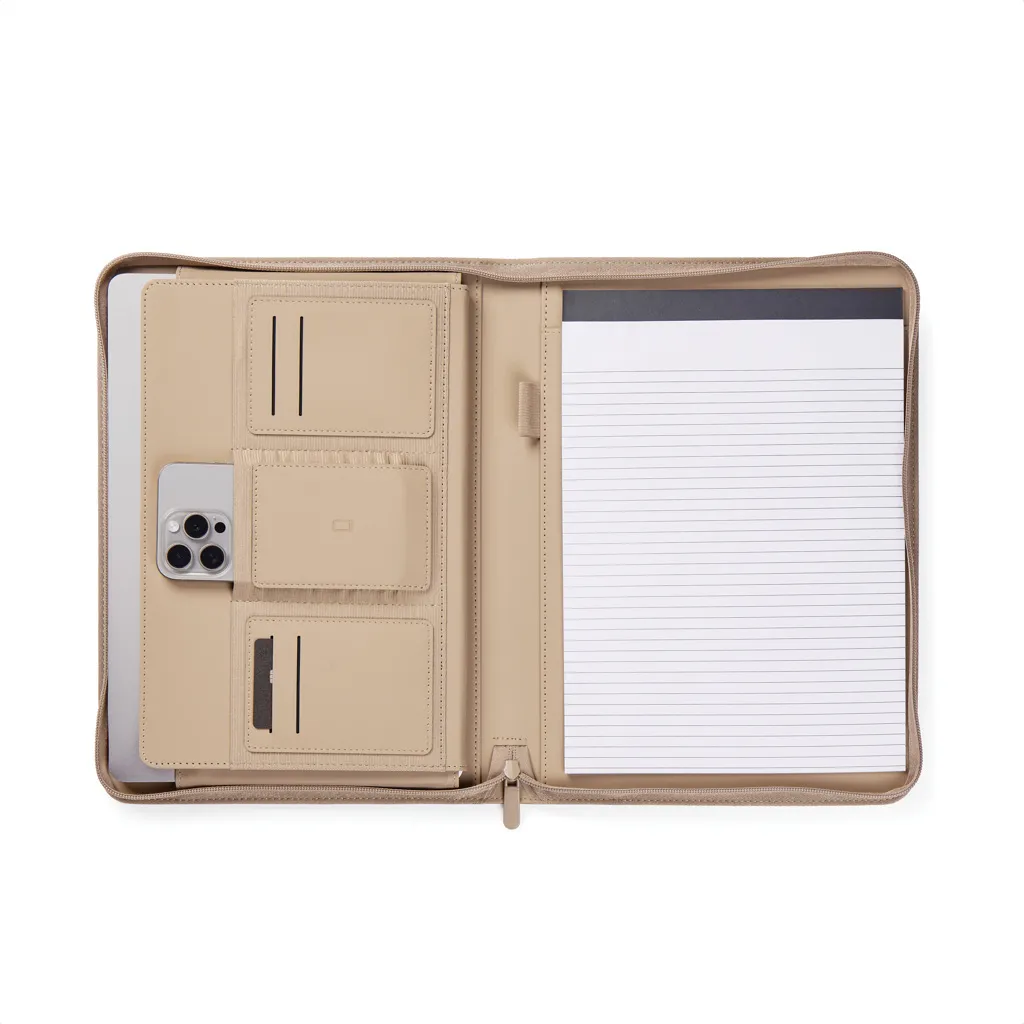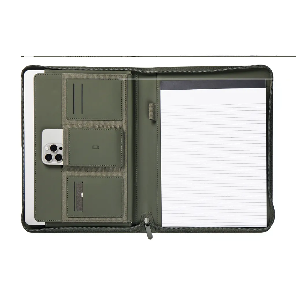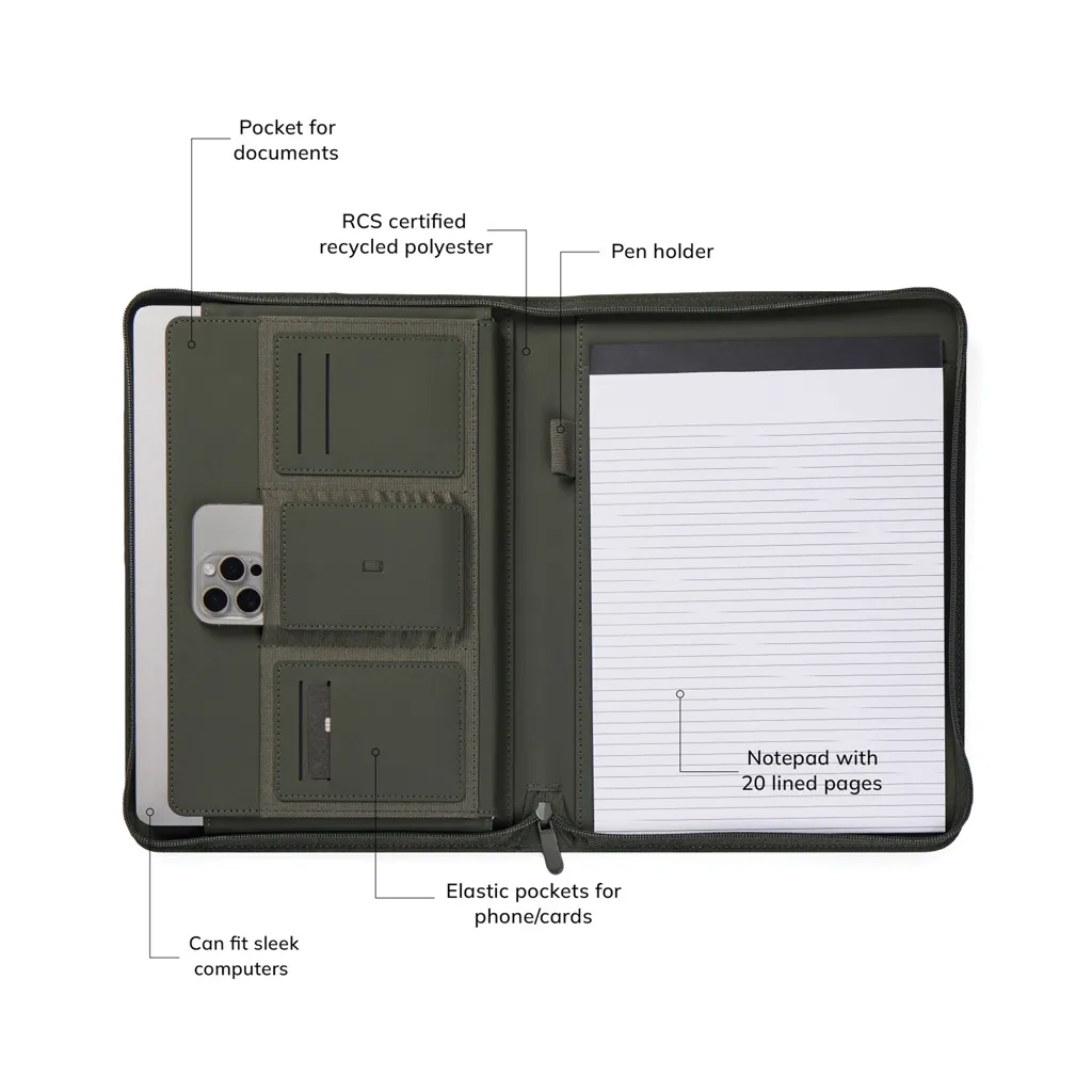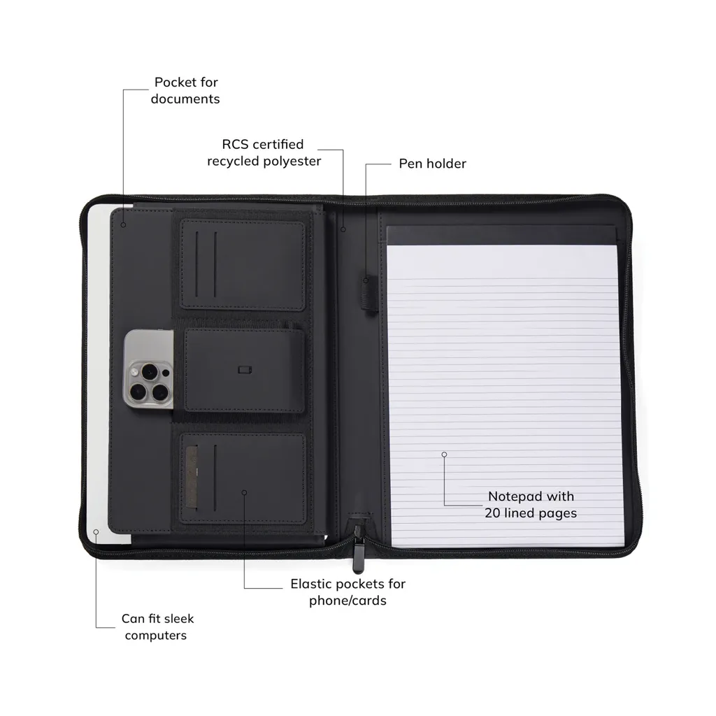 Ostanite organizirani i nosite svoje važne potrepštine uz ovaj elegantni portfolio veličine A4. Sadrži držač za olovke, džep za papir, džepove s elastičnom trakom za kartice, za telefon, zajedno s blokom za pisanje koji sadrži 20 stranica na crte. Izrađen od djelomično recikliranog poliestera, s klasičnim Baltimore mat PU premazom, ovaj je portfolio idealan dodatak za vaš stol ili za ponijeti na put. Papirni umetak je zamjenjiv, što osigurava dugotrajnu upotrebu. Certificiran od strane RCS (Recycled Claim Standard), RCS certifikat jamči da je cijeli opskrbni lanac recikliranih materijala certificiran. Ukupni reciklirani sadržaj temelji se na ukupnoj težini proizvoda. Ovaj proizvod sadrži 6% RCS certificiranog recikliranog poliestera.