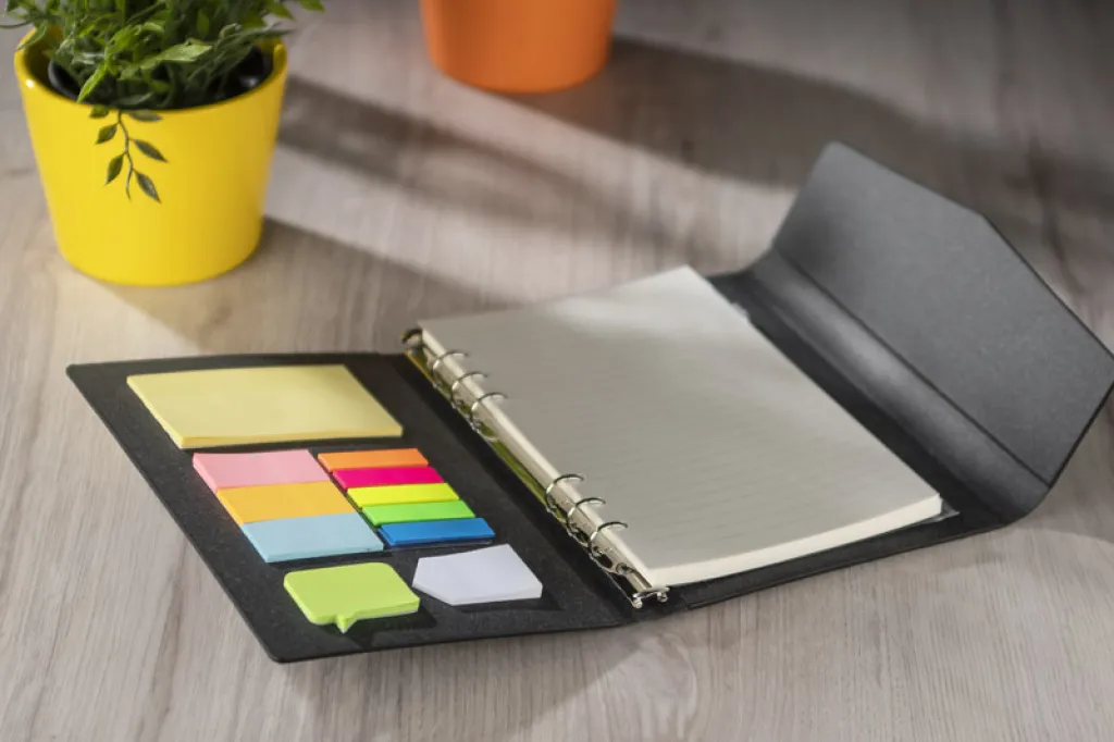 Mapa NOTI sadrži 60 listova s crtama koji se mogu zamijeniti. Zahvaljujući tome, proizvod će služiti dugo vremena. Unutra se nalaze šareni blokići sa samoljeplivim listićima, kao i prozirni džep zatvoren patentnim zatvaračem za odlaganje uredskog materijala, posjetnica ili, primjerice, zaštitne maske. Korica se zatvara magnetom i napravljena je od papira.