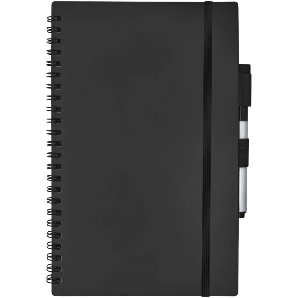 Sadrži 20 listova (40 stranica) s napola točkastim i napola praznim planom te crnim markerom za pisanje.