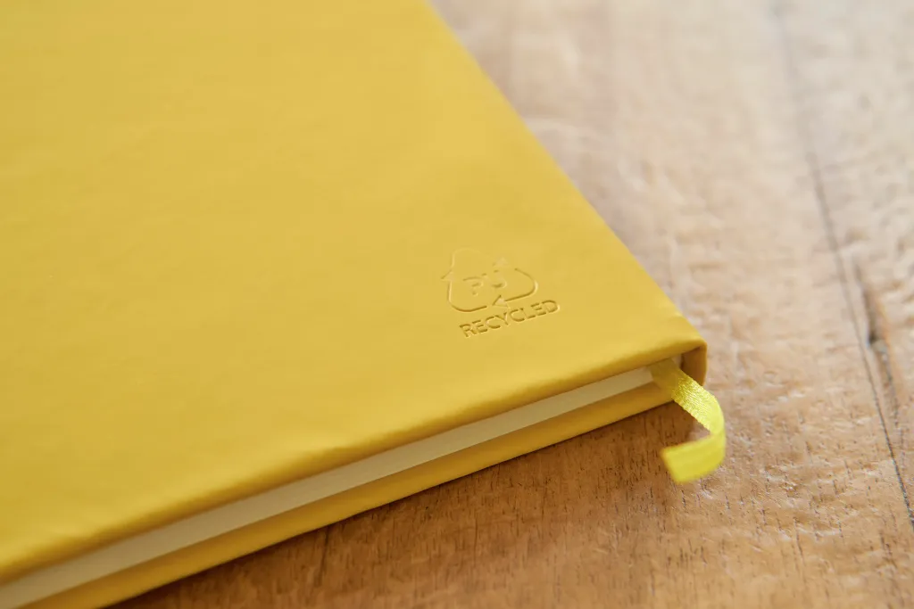 rPET notes (približno A5) s tvrdim koricama od rPET PU materijala, sadrži 80 linijskih stranica (70 gsm). Ima elastičnu traku i trakicu u odgovarajućoj boji. Na stražnjoj strani nalazi se urezani logo recikliranog materijala.