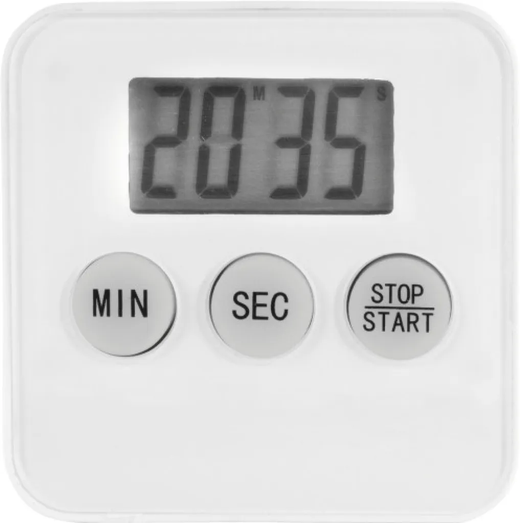 Plastični kuhinjski timer s načinima rada na minute i sekunde, s magnetskom pozadinom. Baterije uključene.