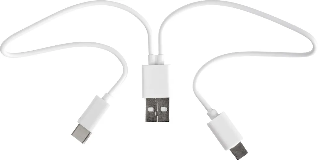 4-u-1 set kabela za punjenje od ABS-a s USB-om, USB-C i mikro USB-om. Mikro USB utikač služi i kao Lightning utikač. Pakiran u kutiji sa stalkom za mobitel. Duljina kabela: cca. 24 cm.