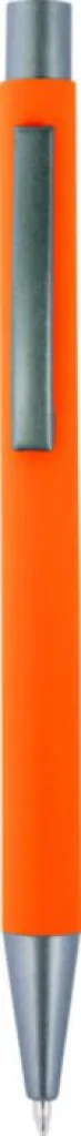 Kemijska olovka s gumiranom završnom obradom. Vrhovi i kopča su iste tamno sivo boje. Plava tinta. Tisak u bijeloj boji.