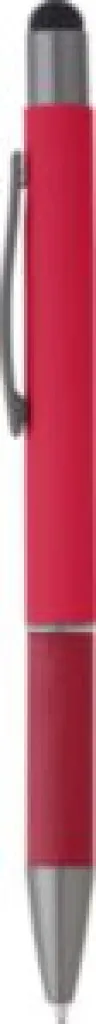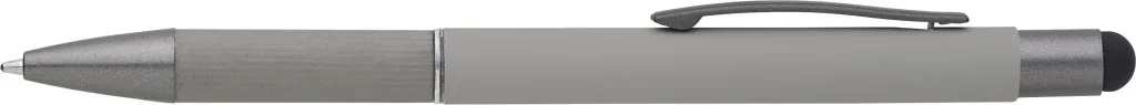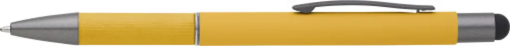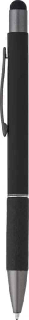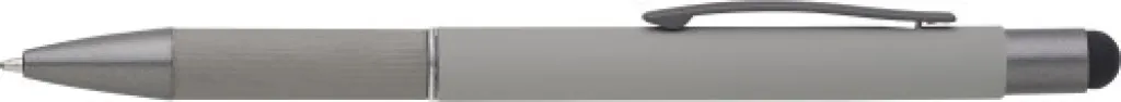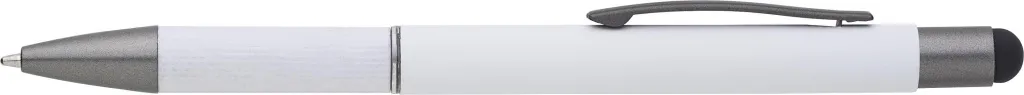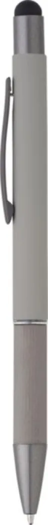 Aluminijska kemijska olovka s detaljima od smotanog papira na dršci. Gumeni vrh za ekrane osjetljive na dodir. Plava tinta.