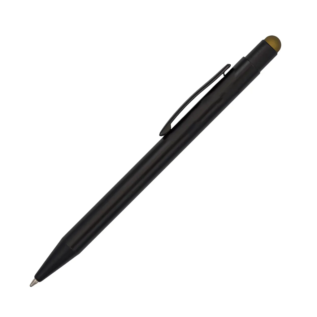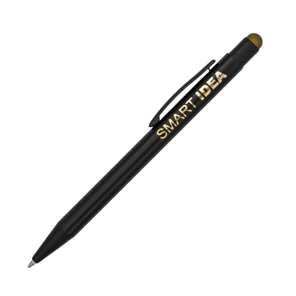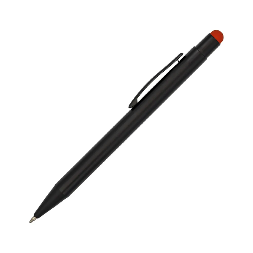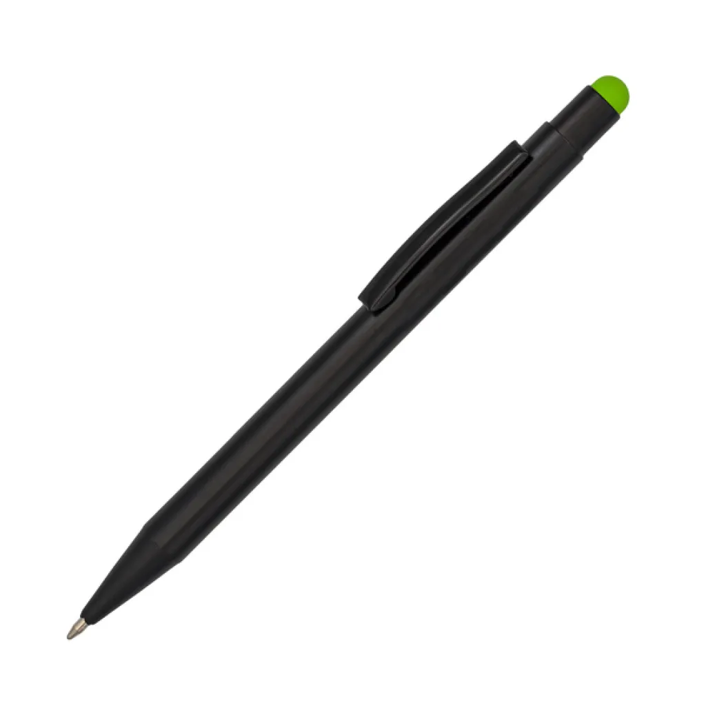 Kemijska olovka s crnim tijelom i vrhom u boji za ekrane osjetljive na dodir. S mogućnošću izrade sjajnog logotipa u boji koja odgovara boji olovke s vrhom na dodir. Plavo punjenje.