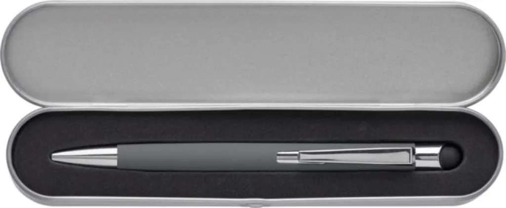 Aluminijska kemijska olovka crne tinte s gumenim premazom i gumenim vrhom za kapacitivne zaslone. Pakirana u metalnu kutiju za olovke.