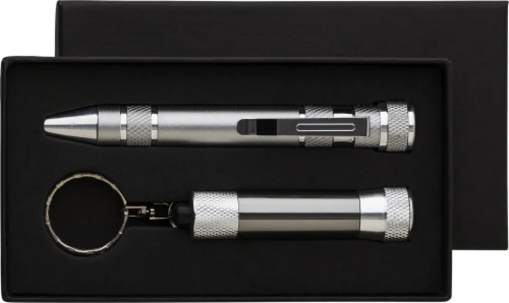 Set metalnih džepnih odvijača u obliku olovke sa svjetlom. Uključuje: četiri bita odvijača s ravnom glavom i četiri bita s križnom glavom. Džepna svjetiljka s tri LED svjetla i držačem za ključeve. Baterije uključene.