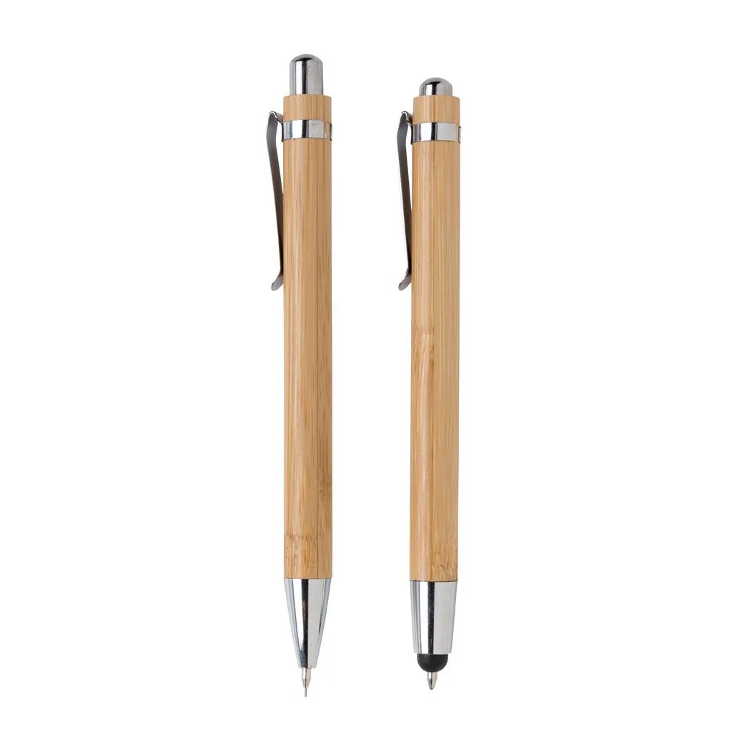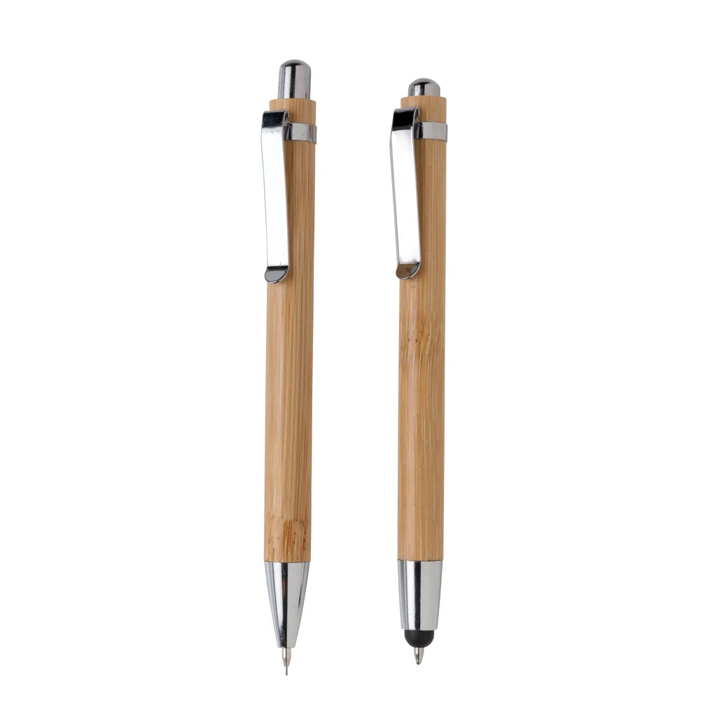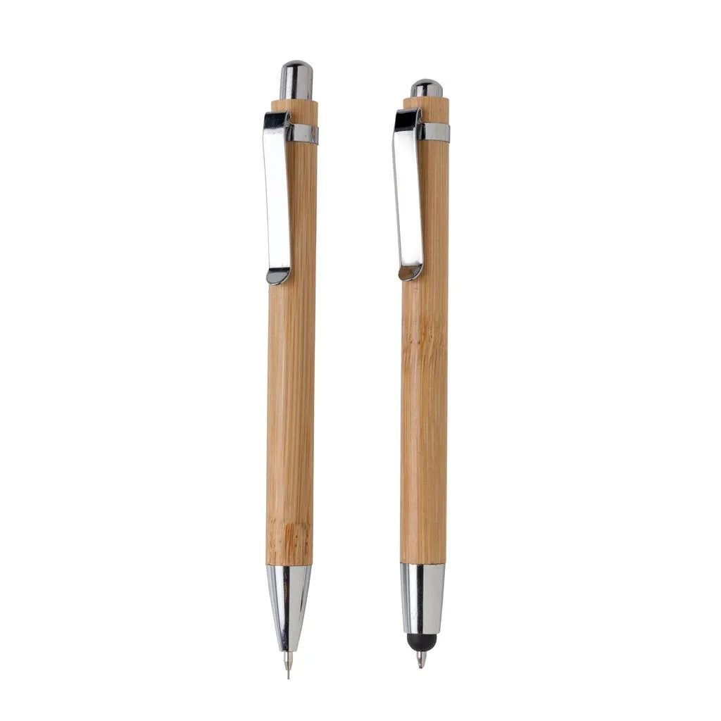 Set olovki od bambusa u poklon kutiji. Kemijska olovka od bambusa s plavom tintom i nastavkom za ekrane osjetljive na dodir te mehanička olovka s 3 komada 0,7 mm grafitne mine.