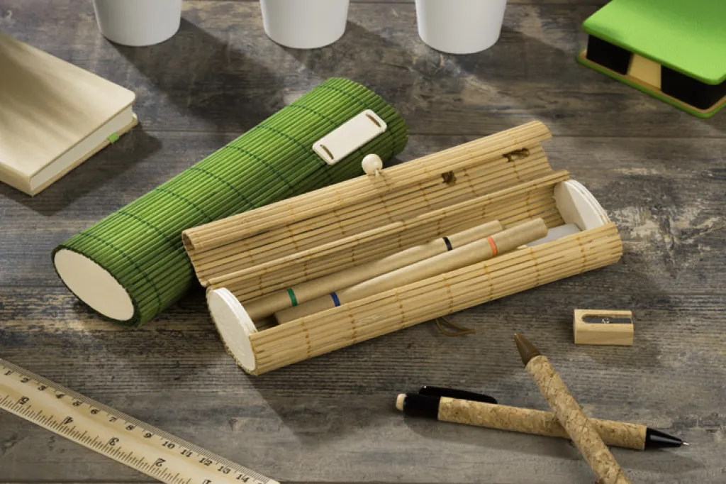 Eko bambus pernica se sastoji od: dvostrane kemijske olovke (plava, crvena, zelena, crna), dvije grafitne olovke, ravnala, šiljila, gumice i samoljepljivog blokića. Ekološki stil, zanimljivi dizajn i korisne značajke kombinirane u jednom proizvodu.