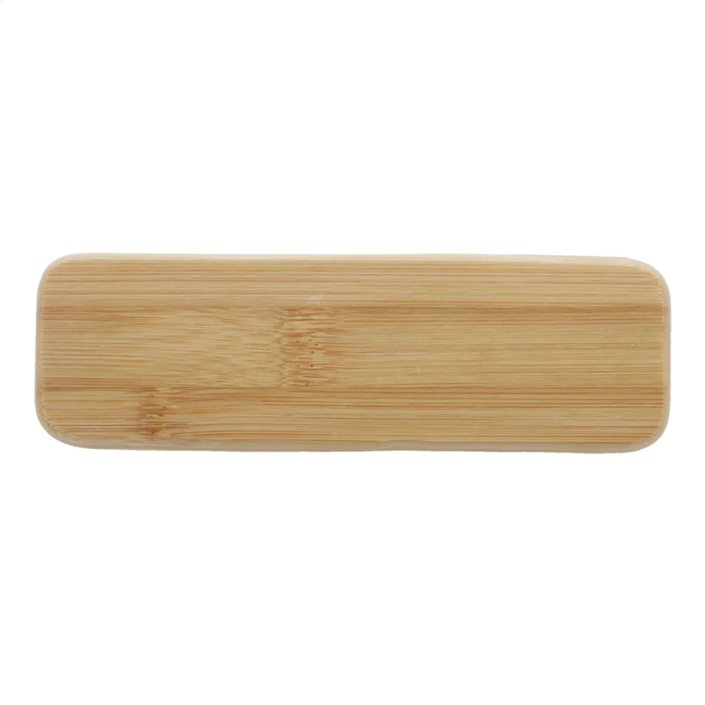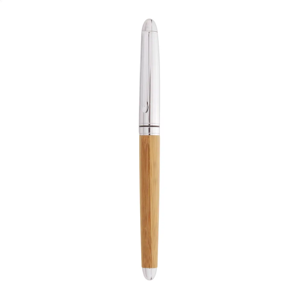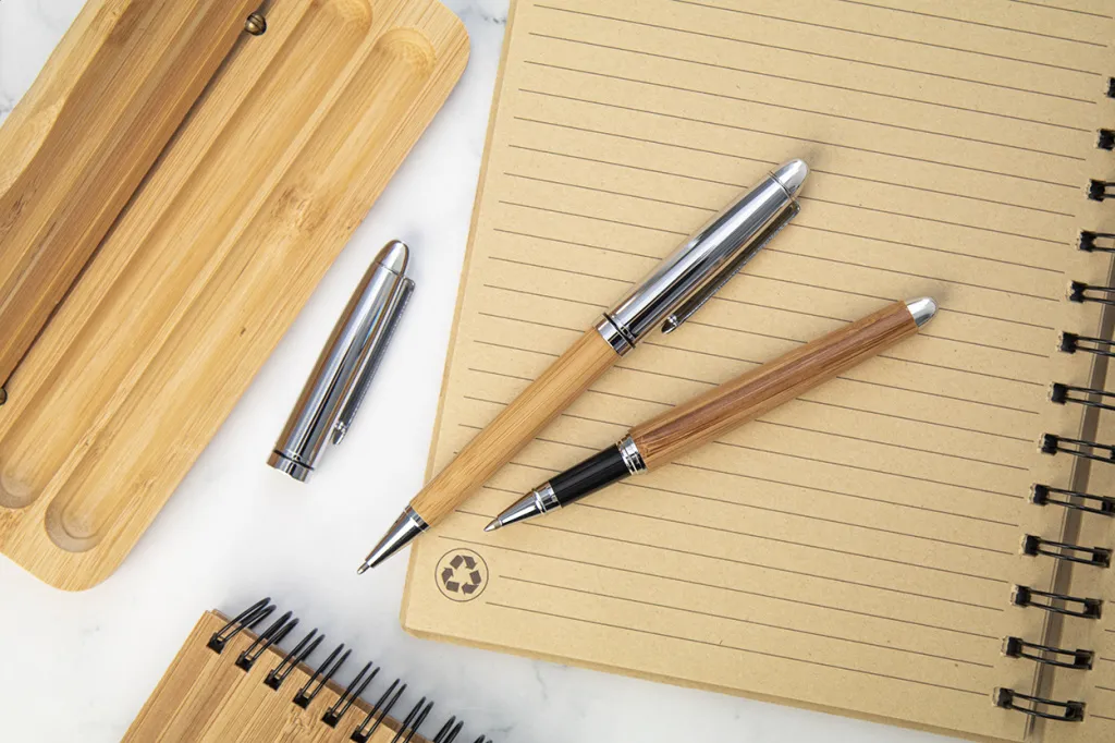 Elegantni set od bambusa i metala sastoji se od kemijske olovke i roller kemijske olovke s plavim punjenjem. Dolaze u poklon kutijici od bambusa.